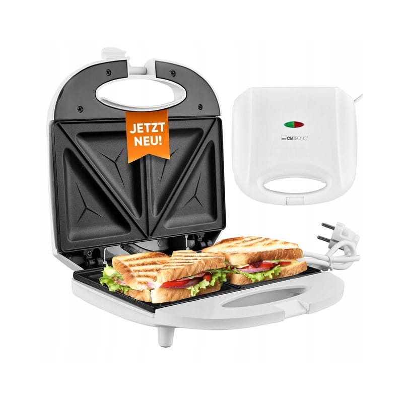NAJWYŻSZEJ JAKOŚCI OPIEKACZ - TOSTER DO KANAPEKRENOMOWANEJ FIRMY CLATRONICMODEL: ST 3813 BIAŁYNowoczesny opiekacz dla miłośników pysznych, ciepłych kanapek z zapiekanym nadzieniem. Za sprawą dużej mocy przygotuje apetyczną przekąskę już w kilka chwil.Ciesz się przyjemnością przygotowywania kanapek na najwyższym poziomie dzięki tosterowi ClatronicTrójkątne płyty kanapkowe zapewniają równomierne opiekanie i doskonałe rezultaty. Dzięki powłoce zapobiegającej przywieraniu czyszczenie jest niezwykle proste.Praktyczna lampka do pieczenia z dwoma lampkami kontrolnymi pozwala w każdej chwili sprawdzić stan pieczenia i temperaturę – dzięki temu każda przekąska będzie udana.Izolowany termicznie uchwyt gwarantuje bezpieczeństwo i wygodę nawet podczas intensywnego użytkowania.Dzięki zabezpieczeniu przed przegrzaniem i gumowym nóżkom toster oferuje niezawodne i długotrwałe działanie. Po prostu idealne do Twojej kuchni!Idealny kształt: trójkątne płyty do kanapek umożliwiają uzyskanie idealnie uformowanych kanapek i równomierne pieczenieWygodne czyszczenie: Dzięki powłoce zapobiegającej przywieraniu resztki można łatwo usunąć, a urządzenie jest szybko gotowe do ponownego użyciaZawsze na widoku: lampka do pieczenia z 2 lampkami kontrolnymi niezawodnie pokazuje gotowość i proces nagrzewania – dla idealnych tostówBezpieczne i łatwe: Izolowany cieplnie uchwyt chroni przed oparzeniami i gwarantuje bezpieczne użytkowanie nawet w wysokich temperaturachSolidna konstrukcja: gumowane nóżki, zabezpieczenie przed przegrzaniem i dwustopniowy system blokowania gwarantują maksymalne bezpieczeństwoPanele warstwowe trójkątnePowłoka zapobiegająca przywieraniuUchwyt izolowany termicznieAutomatyczna kontrola temperatury2 kontrolki zasilania i ogrzewania (podświetlenie)Zmienny system blokowania (2-stopniowy)Wyłączenie bezpieczeństwaPewna pozycja dzięki gumowym nóżkomZabezpieczenie przed przegrzaniem220-240 V, 50 Hz, 680-820 W