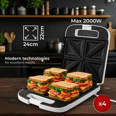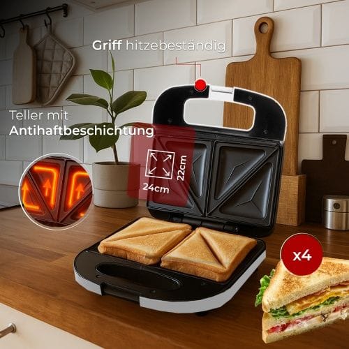 •Opiekacz na 4 kanapki •Płyty grzewcze pokryte nieprzywierającą powłoką •2 lampki kontrolne: zasilania i nagrzewania•Przechowywanie w pozycji pionowej•Stabilne, gumowe nóżki•Uchwyt izolujący przed gorącem•Duża powierzchnia płyty 24*22 cm•Wymiary urządzenia 32*25*9,5 cm•Kolor urządzenia: biały •Długość przewodu zasilającego: 75cm •Typ wtyczki:E/F•Zasilanie 220-240V ~ 50/60Hz•Moc nominalna 1400W•Moc maksymalna 2000W