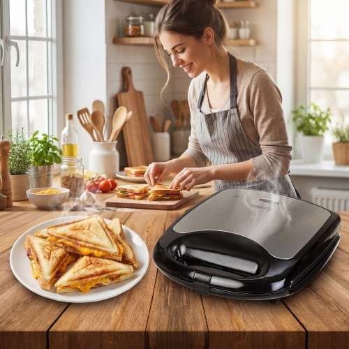 Z bogatej oferty opiekaczy do kanapek trudno nam się tak od razu zdecydować na jakiś model. My tutaj polecamy prosty i funkcjonalny model opiekacza Camry CR 3023. Opiekacz ma moc 1100 W i to jest moc, która pozwoli Ci zrobić w błyskawicznym tempie cztery kanapki. Powłoka na płytach grzewczych zapobiega przywieraniu i jest bardzo łatwa w utrzymaniu jej w czystości. Termostat zasygnalizuje, kiedy płyty są już wystarczająco nagrzane i można włożyć porcję sandwichy do środka.