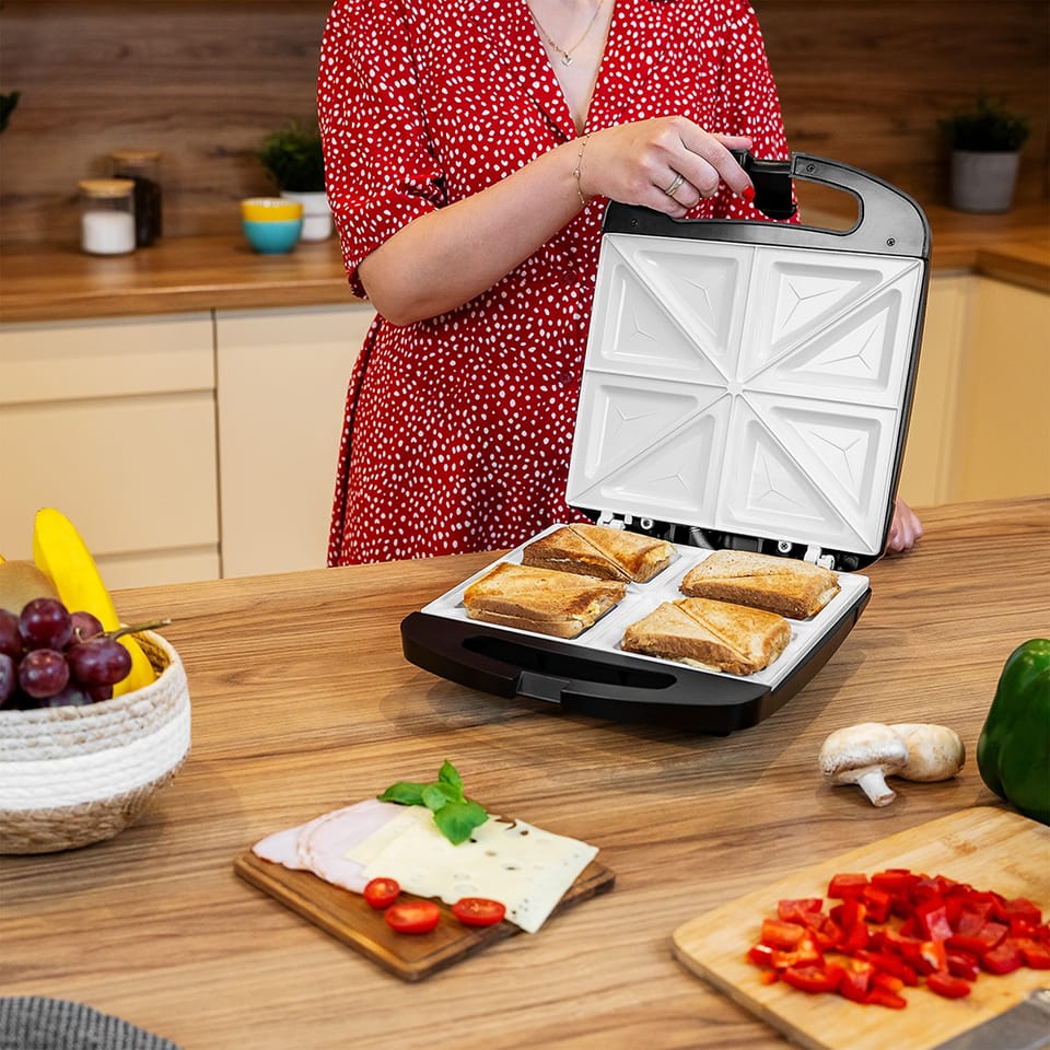 Chcesz, aby pieczywo było zawsze chrupiące? A może po prostu chcesz urozmaicić przyrządzane posiłki? Już dziś wypróbuj opiekacz Teesa TSA3229, a już nigdy nie będziesz chciał wrócić do klasycznych kanapek! Urządzenie umożliwia zrobienie czterech tostów na raz, a duża moc 1500 W sprawia, że nagrzewa się ono niesamowicie szybko. Pozwoli Ci to w mgnieniu oka przygotować śniadanie dla całej rodziny. Bez wątpienia spodoba Ci się również to, że opiekacz został wyposażony w zapobiegające przywieraniu płyty z powłoką ceramiczną, dlatego masz pewność, że nie będziesz tracić czasu na żmudne czyszczenie.