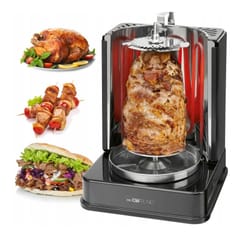 OPIEKACZ DO KEBABA ROLLER GRILL KURCZAKA SZASZŁYKI DONER ROŻEN ELEKTRYCZNY Któż z nas nie lubi grillowanych potraw Pysznych przypieczonych warzyw i mięs, z chrupiącą skórką, pachnących i ciepłych. Kto z nas z przyjemnością nie przekąsi w ciągu dnia pożywnej, ciepłej kanapki z gyrosem i warzywami lub szaszłyka z ulubionymi składnikami Wszystkie te pyszności w mig przygotujesz z pionowym multigrillem. I nie musisz się już bać spożywania nadmiaru tłuszczu, ponieważ w trakcie opiekania, tłuszcz częściowo wypłynie z potrawy, abyś mógł jeść zdrowo i smacznie. Skorzystaj z dołączonych dodatków i ciesz się:grillowanym kurczakiem lub kiełbaskamikebabem, który dodasz do kanapki, zawiniesz w tortillę lub zjesz w zestawie obiadowymszaszłykami z kiełbasą, serem, warzywami i owocami - w dowolnej kombinacji Najważniejsze cechy elektrycznego multigrilla Kebab Clatronic DVG 3686:¦ Dzięki pionowej pozycji rusztu, wyciekający tłuszcz i sos kapie bezpośrednio do tacy na tłuszcz¦ Taca na tłuszcz i okruchy została wykonana ze stali nierdzewnej¦ W zestawie. 1 rożen obrotowy (duży) na kurczaki lub kebab / gyros¦ W zestawie. 6 oddzielnie obracanych małych szpikulców do szaszłyków¦ W zestawie. szczypce ze stali nierdzewnej¦ Wskaźnik świetlny¦ 220–240 V, 50/60 Hz, 1400 W.Waga netto: ok 2,4kg Doner multigrill jest prosty w obsłudze. Równomiernie opiecze zamocowane na obrotowym, pionowym ruszcie produkty. Czy to będzie mięso, czy warzywa. Silnik o mocy 1400 W będzie obracał ruszt wokół osi, a w przypadku chęci przygotowania szaszłyków - 6 szpilek do szaszłyków. To właśnie dzięki temu, powolnemu ruchowi mamy pewność, że umieszczone produkty będą tak samo upieczone z każdej strony. W komplecie znajduje się: rożen obrotowy do drobiu, kebaba i innych produktów, 6 szpikulców do szaszłyków, taca na tłuszcz i okruchy oraz uchwyt ze stali nierdzewnej do zdejmowania gorących akcesoriów. Specyfikacja:Model: DVG 3686Kolor: CzarnyMoc: 1400 WZasilanie: 220 - 240 V~, 50 / 60Hz