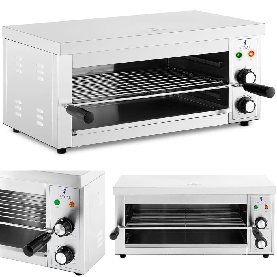 Kod producenta: 10011986Salamander marki Royal Catering sprawdzi się w restauracji, barze czy w food trucku. Pozwala przygotować smaczne, gorące przekąski. Profesjonalny elektryczny piekarnik powstał z myślą o komercyjnym użytku w branży gastronomicznej. Posłuży do przyrządzenia tostów, bagietek lub różnego rodzaju zapiekanek. Duża moc grzewcza 2500 W pozwala szybko osiągnąć zadaną temperaturę. Jej wartość reguluje się za pomocą pokrętła w zakresie 50-300deg;C. Termostat utrzymuje temperaturę na stałym poziomie podczas procesu grillowania. Wbudowany timer z sygnałem dźwiękowym (0-30 min) umożliwia przyrządzanie zawsze idealnych potraw. Obudowa urządzenia została wykonana ze stali nierdzewnej, łatwej w czyszczeniu. Dodatkowo za higienę odpowiada pojemnik na okruchy i inne pozostałości. Kompaktowa konstrukcja umożliwia łatwy transport opiekacza, gumowe nóżki zapewniają mu stabilność.Cechy produktu: