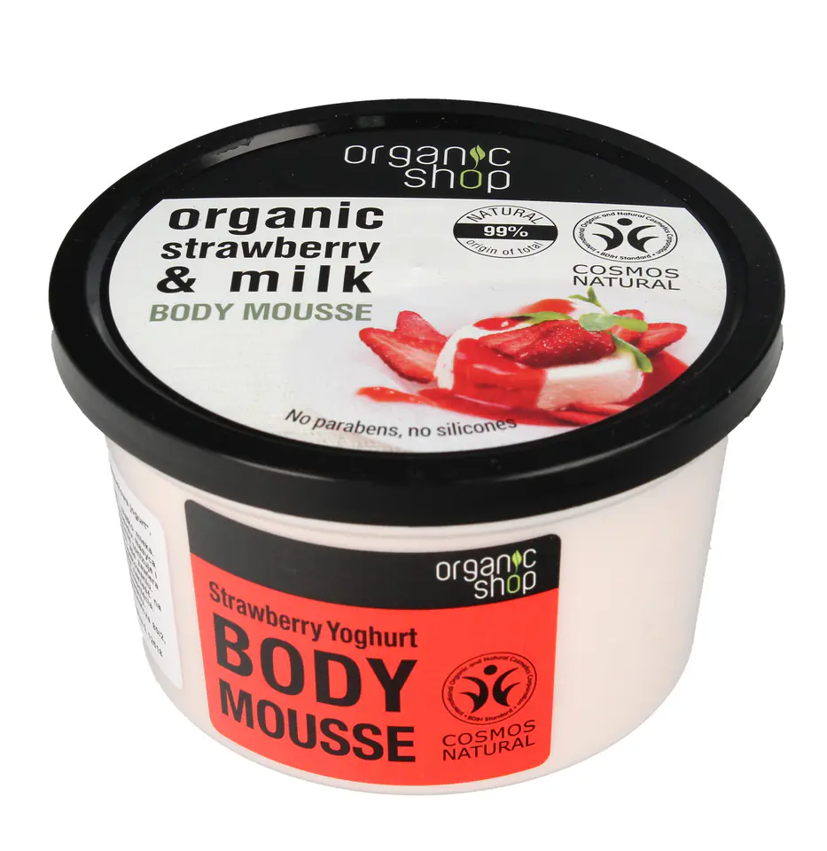 Organiczny mus do ciała Truskawkowo Jogurtowy.Jego skład oparty na bazie organicznego wyciągu z mleka i truskawek bogaty w witaminy i mikroelementy, odżywia skórę i przywraca blask nadając jej aksamitną delikatność.