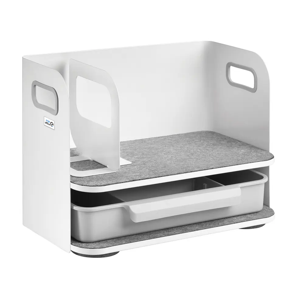 ERGO OFFICE ER-440Wysokiej jakości organizer biurkowy z szufladą to idealne rozwiązanie dla utrzymania porządku na biurku.Półka z podpórką nadaje się do przechowywania książek i dokumentów, natomiast szuflada z czterema przegródkami przeznaczona jest do przechowywania akcesoriów biurowych.