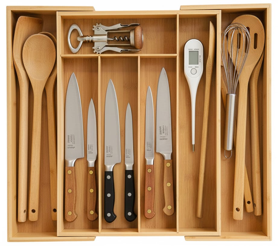 Organizer na sztućce bambusowy IKAR⭐️ Regulowana szerokość: 33,5 - 50,5 cm⭐️ Kolor: naturalny⭐Organizer do szuflady na sztućce Ikar – Styl i porządek w jednym⭐Organizer Ikar to połączenie elegancji i funkcjonalności. Wykonany z naturalnego drewna bambusowego, zachwyca ciepłym odcieniem i subtelną fakturą, która dodaje wnętrzu przytulnego charakteru. Dzięki regulowanej szerokości od 33,5 do 50,5 cm, bez trudu dopasujesz go do różnych rozmiarów szuflad. Siedem praktycznych przegródek pozwala utrzymać idealny porządek wśród sztućców i drobnych akcesoriów. Uniwersalny design sprawia, że organizer sprawdzi się nie tylko w kuchni, lecz także w biurze czy łazience – wszędzie tam, gdzie cenisz harmonię i funkcjonalność w eleganckim wydaniu.Cechy:Materiał: drewno bambusowe, płyta MDFIlość przegródek: 7Waga: 1,35 kgKolor: naturalnyRegulowana szerokość: Tak Wymiary:Wysokość: 5 cmSzerokość regulowana: 33,5 - 50,5Głębokość: 45,5 Informacje dodatkowePrzedstawione kolory należy traktować poglądowo - mogą odbiegać od rzeczywistych ze względu na różne ustawienia monitorów oraz proces obróbki zdjęć. Rzeczywiste wymiary mogą się różnić od podanych wyżej. Tolerancja błędów może wynosić +/- 5%. Marka:GockowiakKod produktu:329382MGKod EAN:5902340329382Kolor:naturalny bambusWysokość:5 cmSzerokość regulowana:33,5 - 50,5 cmDługość:45,5 cmIlość przegródek:7