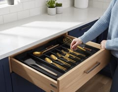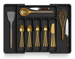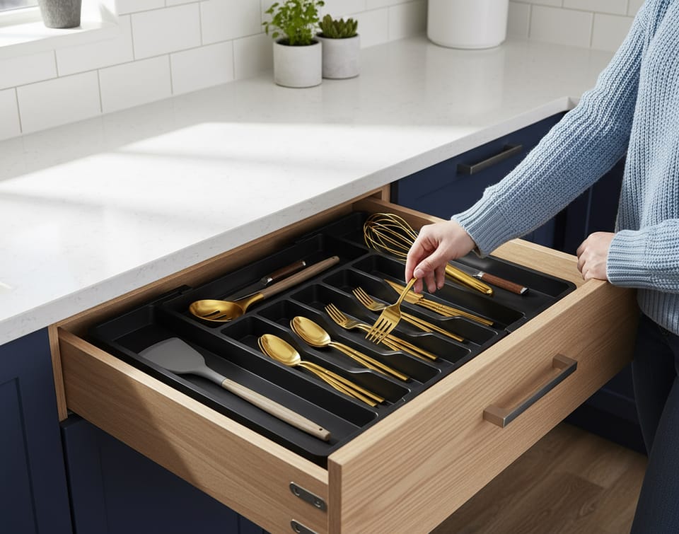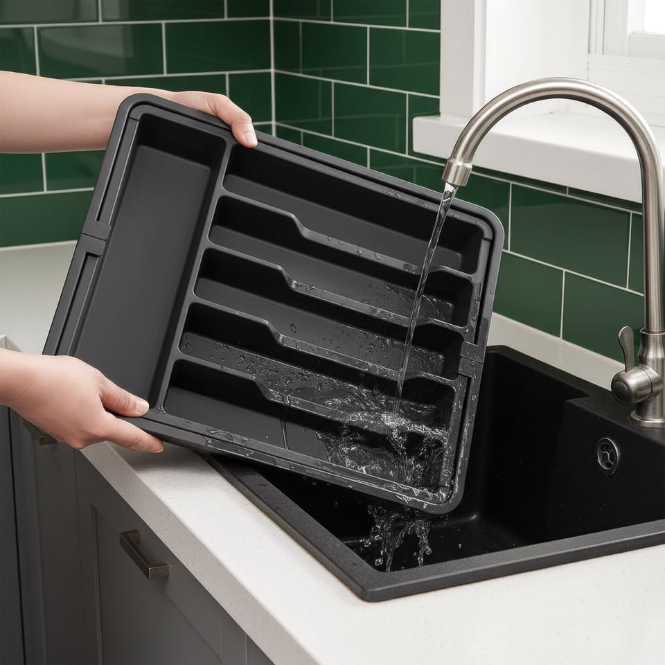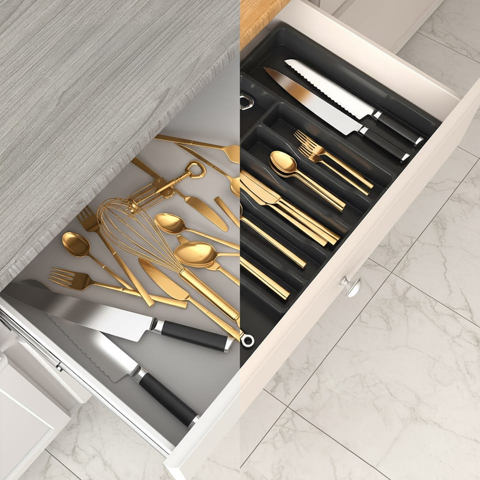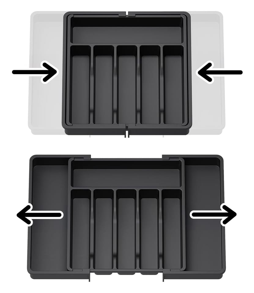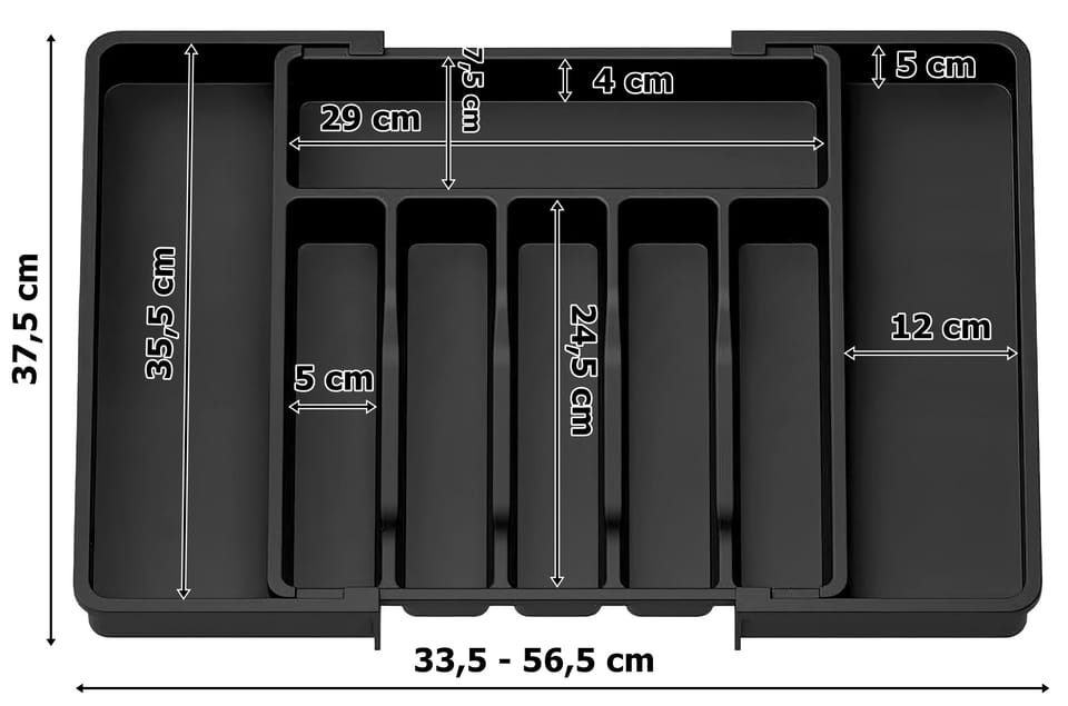 Organizer na sztućce rozsuwany GARFO⭐️ Regulowana szerokość - 33,5 cm - 56,5 cm⭐️ Od 6 do 8 przegródek⭐️ Trwały materiał PP⭐️ W uniwersalnym, czarnym kolorze⭐️ Zakup od producenta✨Organizer na sztućce Garfo - Rozsuwany organizer do szuflady✨Organizer Garfo marki Gockowiak to funkcjonalny dodatek do każdej kuchni, który pomaga w utrzymaniu porządku w szufladach. Dzięki rozsuwanej konstrukcji dopasujesz go idealnie do szerokości swojej szuflady, unikając wolnych przestrzeni lub zbyt ciasnego dopasowania. Wykonany z trwałego tworzywa PP (polipropylen), jest odporny na codzienne użytkowanie. Organizer oferuje 6 przegródek na podstawowe sztućce (noże, widelce, łyżki, łyżeczki), a po rozsunięciu – dodatkowe 2 na akcesoria kuchenne. Pasuje do każdej kuchni!Cechy:Materiał: PP (polipropylen)Marka: GockowiakKolor: czarnyRegulowana szerokośćLiczba przegródek: od 6 do 8Zastosowanie: do przechowywania sztućców, przyborów kuchennych, akcesoriów Wymiary:Szerokość: 33,5 – 56,5 cmWysokość: 5,5 cmGłębokość: 37,5 cm Informacje dodatkowePrzedstawione kolory należy traktować poglądowo - mogą odbiegać od rzeczywistych ze względu na różne ustawienia monitorów oraz proces obróbki zdjęć. Rzeczywiste wymiary mogą się różnić od podanych wyżej. Tolerancja błędów może wynosić +/- 5%.Marka:GockowiakKod produktu:332047MGKod EAN:5902340332047Kolor:czarnyMateriał:PPRozsuwany:tak