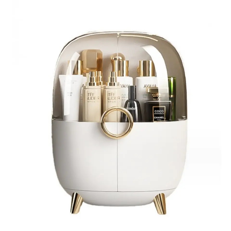 Praktyczny organizer na kosmetyki, biżuterię lub inne akcesoria dla każdej kobiety Jest piękny, elegancki i bardzo pojemny.Oprócz tego jest wyjątkowo piękny i będzie służył jako dekoracja pomieszczenia.Charakteryzuje się pojemnymi szufladkami oraz dużą gablotką na perfumy, balsamy lub kremy. Pozwoli zachować ład i porządek w podręcznych drobiazgach.Organizer wykonany został z akrylu w modnym kolorze, dodatkowo elementy w kolorze złotym sprawiają, że produkt prezentuje się ekskluzywnie. Przeźroczyste wieko pozwala z łatwością odnaleźć potrzebny kosmetyk. Cechy produktu:Materiał: AkrylKolor dominujący: EcruSzerokość: 27Wysokość: 36Głębokość: 18 Materiał:Akryl Świetnie sprawdzi się w formie prezentu.