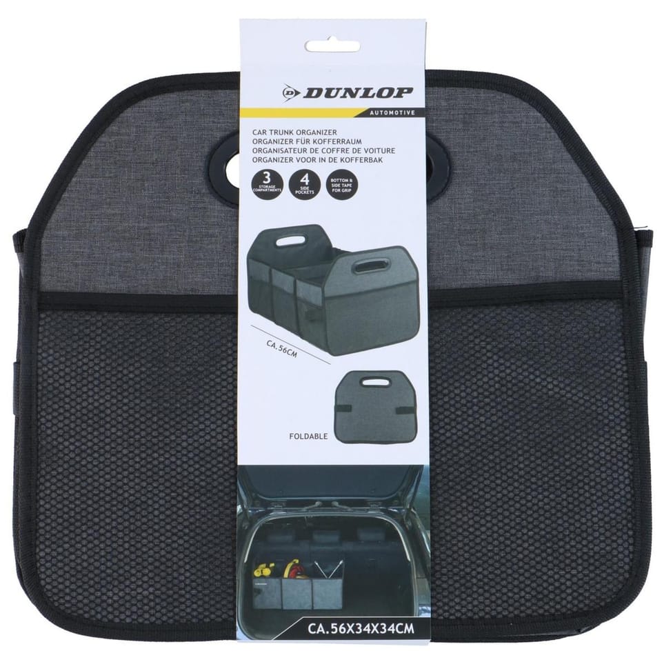 - wyposażony w 3 komory o wymiarach około 19 x 33 x 21 cm z usztywnianym dnemz uchwytami po obu stronach ułatwiającym przenoszenie i z rzepami na dnie zapewniającymi lepszą przyczpnośćumożliwia wygodne przechowywanie zakupów, akcesoriów samochodowych i rzeczy podróżnychkieszenie z siatki pozwalają szybko sięgnąć po drobne przedmiotyskładana konstrukcja pozwala złożyć organizer, gdy nie jest używanyuniwersalny design marki Dunlop pasuje do większości samochodów