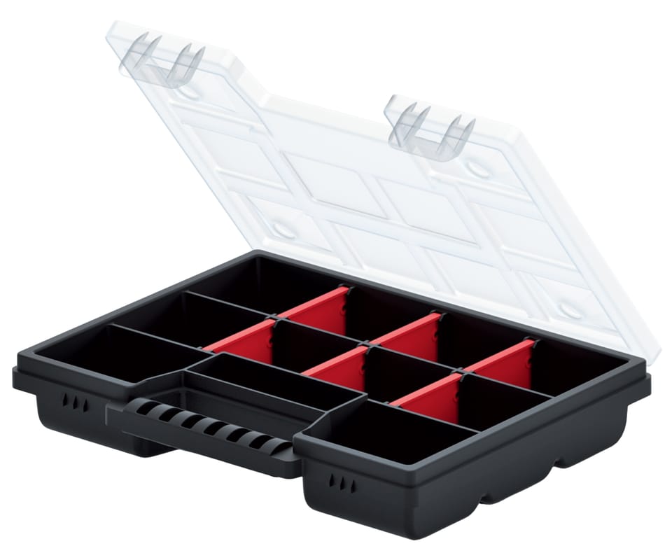 Uniwersalny organizer z serii NOR o regulowanych przegródkach ? wygodne rozwiązanie, dzięki któremu można dostosować wielkość i ilość przegródek do swoich potrzeb. Transparentna pokrywa pozwala bez otwierania sprawdzić, co jest w środku, a dzięki mocnej rączce organizer można bez trudu przenieść w inne miejsce. Maksymalna ilość przegródek to 18 szt.