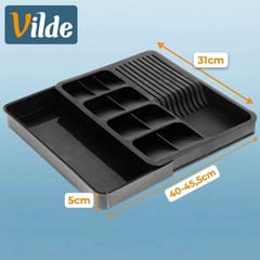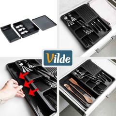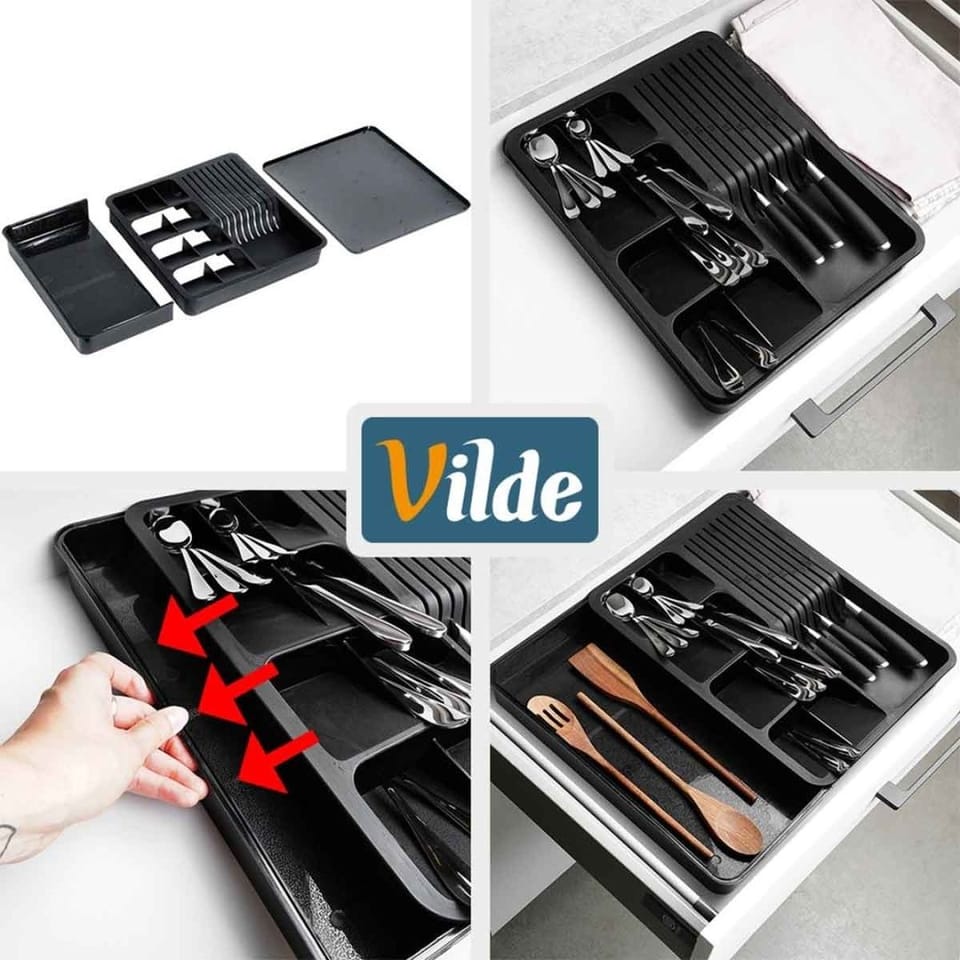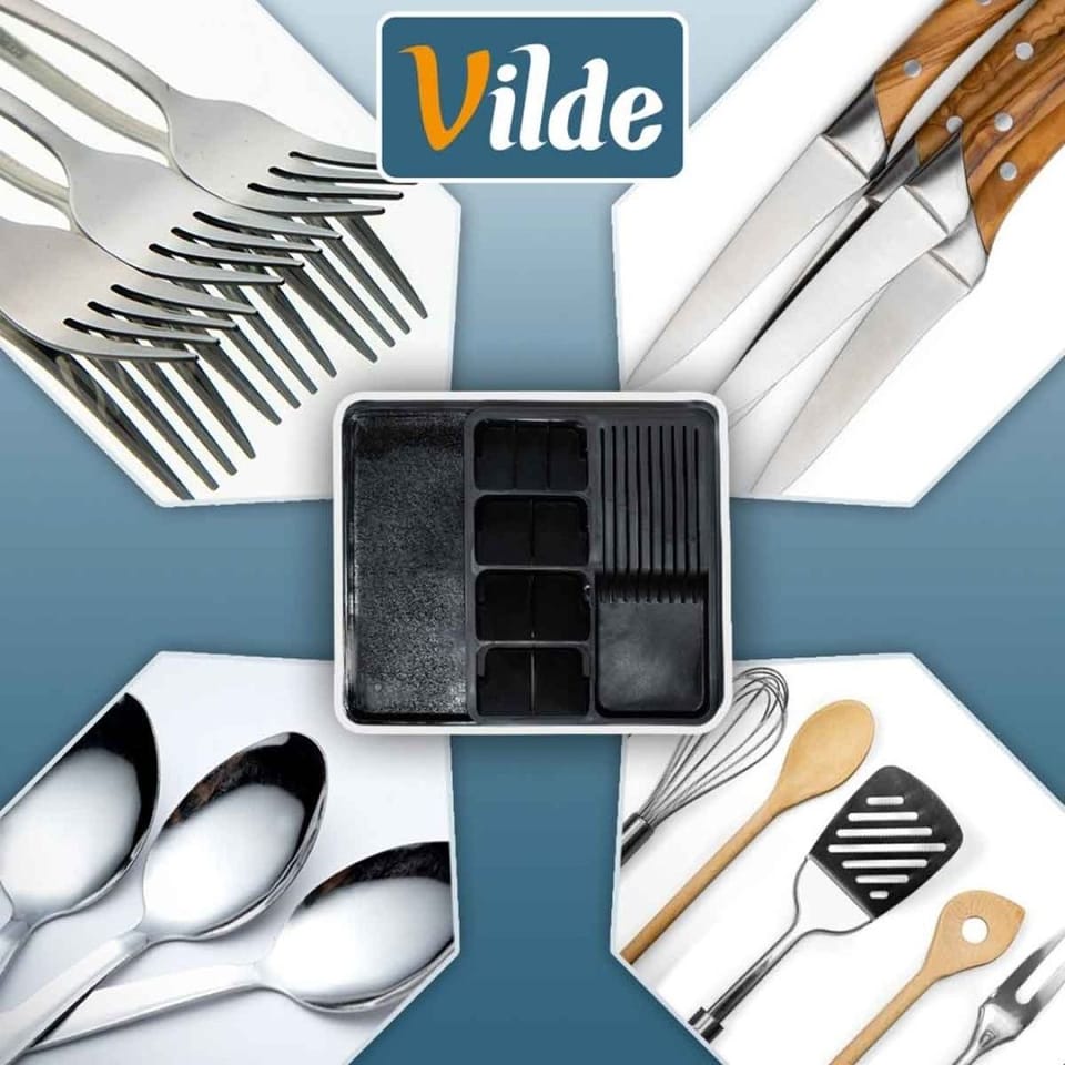 Organizer na sztućce, noże oraz przybory kuchenne z rozsuwanym elementem. Przydatny w każdej kuchni. Umożliwia przechowywanie różnych akcesoriów kuchennych w sposób uporządkowany i zorganizowany. Taca do szuflady pozwoli odpowiednio zagospodarować przestrzeń oraz utrzymać porządek wewnątrz szuflady. Łatwy w czyszczeniu i wygodny w użytkowaniu. Oryginalny produkt marki Vilde. Wyprodukowano zgodnie z europejskimi standardami.
