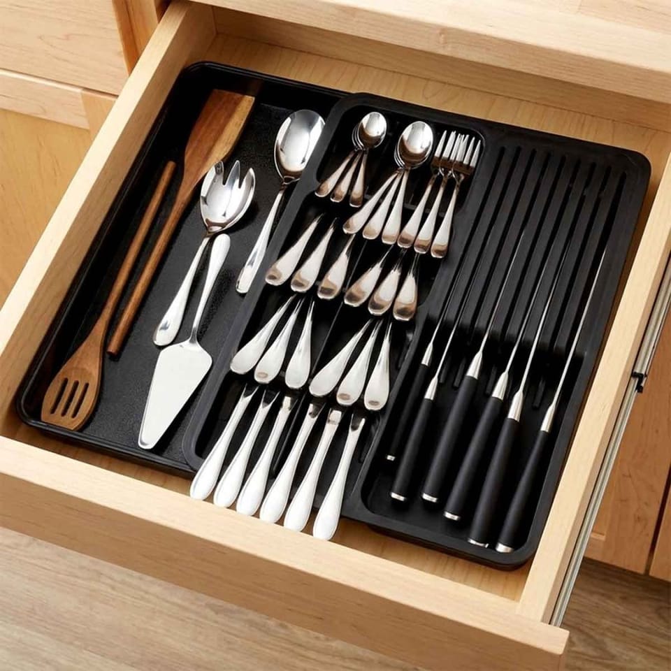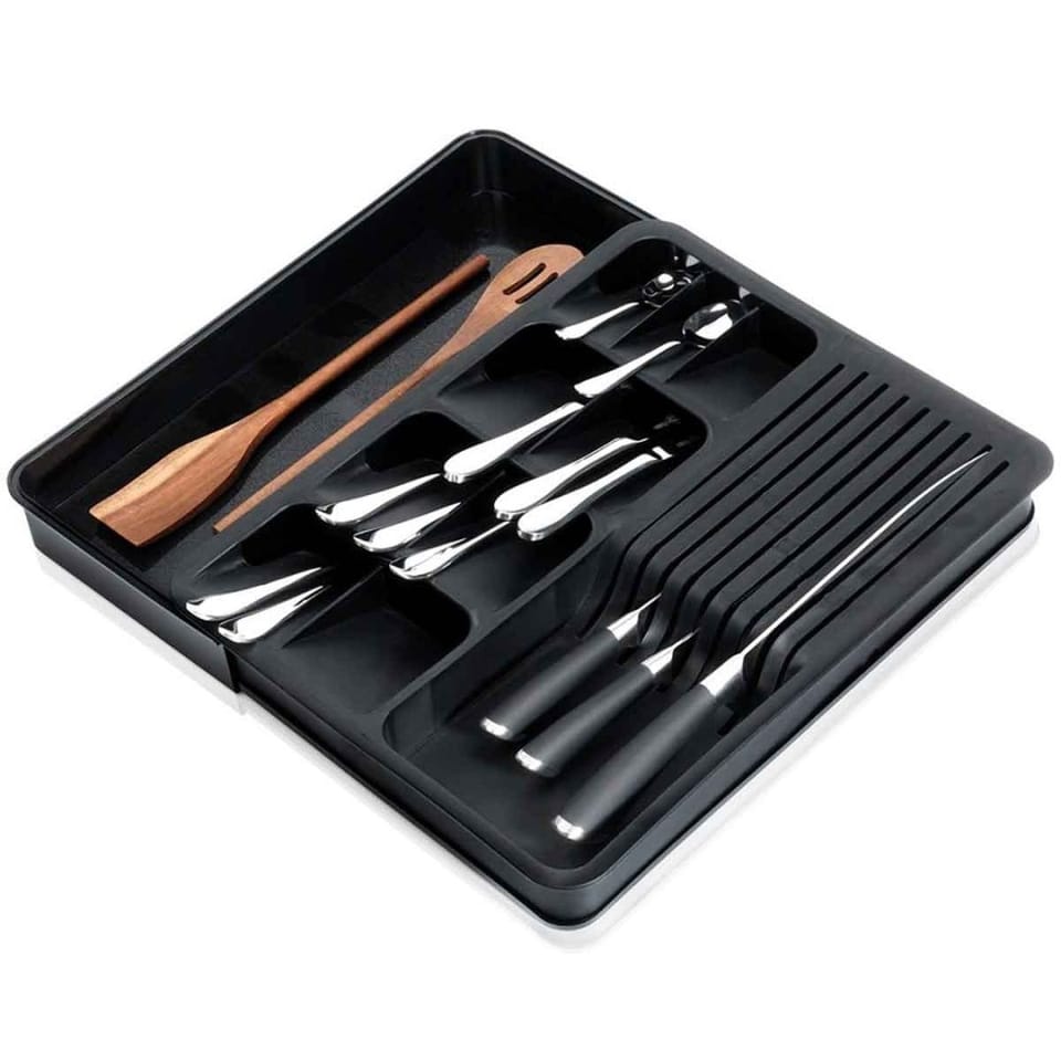 Niezwykle praktyczny organizer na sztućce, noże i przybory kuchenne. Zajmuje mało miejsca, ale dzięki swojej konstrukcji jest bardzo pojemny - posiada rozsuwany element.