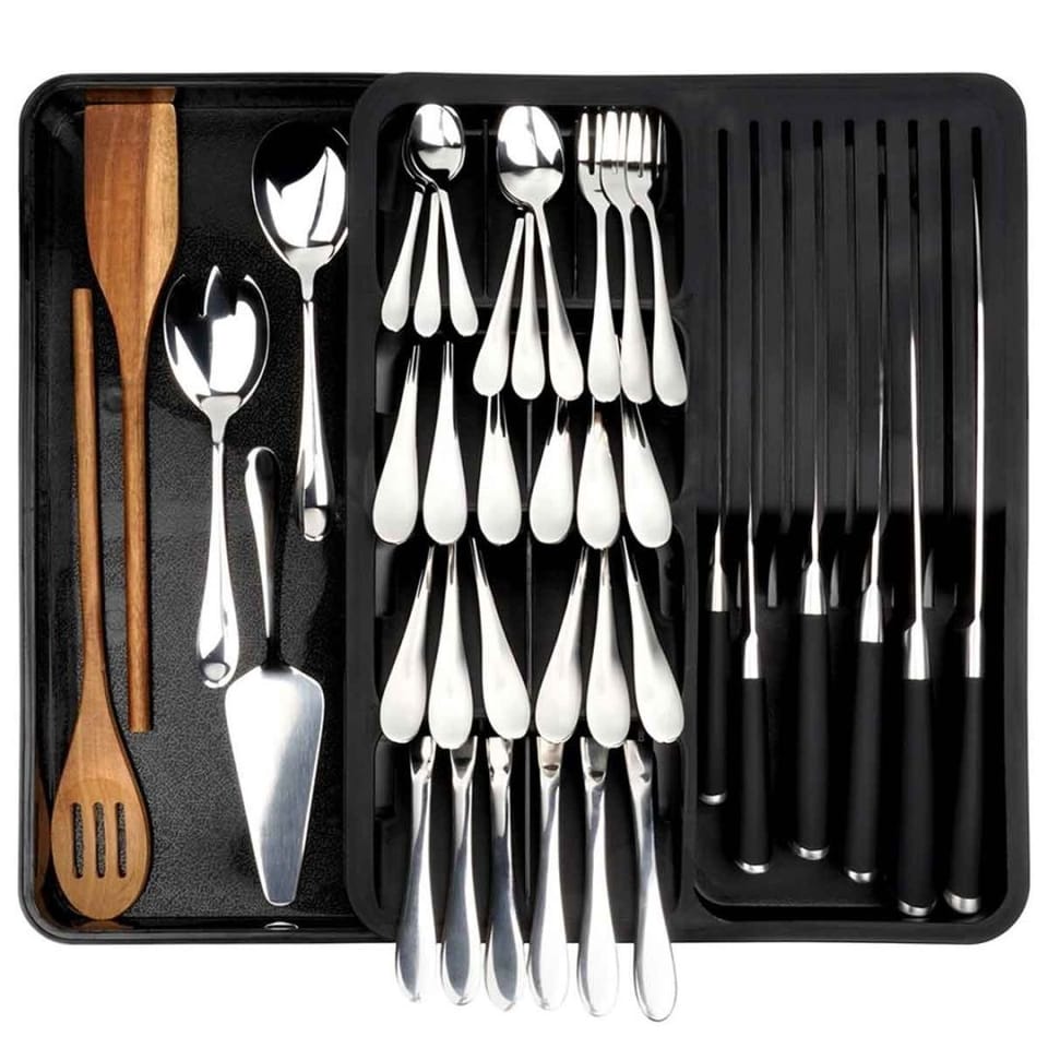 - Wkład na sztućce i przybory kuchenne do szuflady - Organizer na sztućce i przybory kuchenne umożliwiający wygodne posegregowanie noży oraz sztućców. Wkład ma wymiary 40 x 31 x 5 cm. Doskonały na sztućce, noże oraz akcesoria kuchenne.