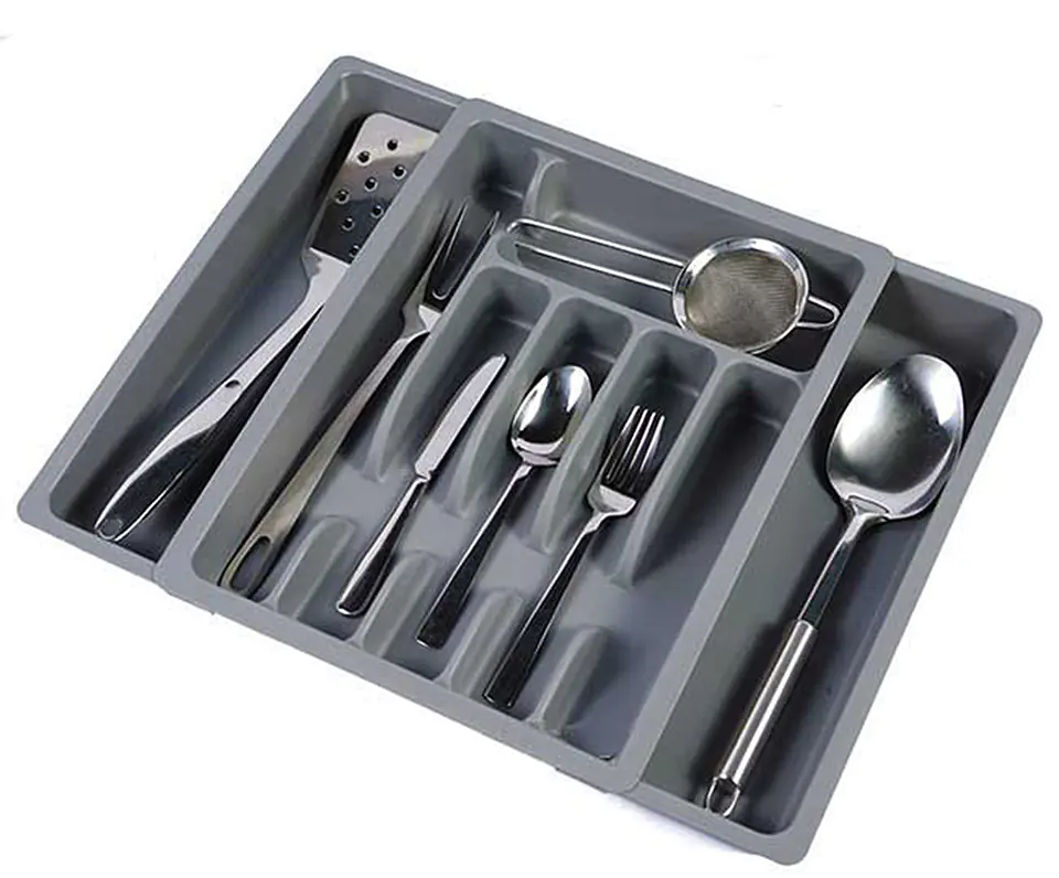 Dzięki regulowanemu płynnie rozmiarowi można dopasować go do szuflad o szerokości od 28,5 do 47cm. Pozwoli na uporządkowanie sztućców oraz przyborów kuchennych w szufladach.