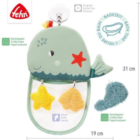 Organizer z przyssawką i zabawki do kąpieli, Wieloryb z kolekcji: Chlap i się bawOrganizer na zabawki do kąpieli, Wieloryb z kolekcji: Chlap i się bawPraktyczny organizer z przyssawką przeznaczony na zabawki do kąpieli Do zamocowania na ścianie lub w wannie. Idealny towarzysz na każdy dzień: dzięki wielorybowi dziecko może cieszyć się wieloma ekscytującymi godzinami zabawy. Po przymocowaniu do ściany wanny za pomocą przyssawki, mniejsze zabawki do kąpieli można ukryć w siatce. Wielkiemu wielorybowi towarzyszy mały wieloryb z ukrytym szeleszczącym papierem i rozgwiazda oraz muszla z grzechotkami, które zapewniają pobudzają ciekawość. Odważne kolory i urocze detale sprawiają, że zabawka przyciąga wzrok, grzechotki i szeleszczący papier zachęcają do chwytania oraz stymulują zmysły dziecka.Organizer na zabawki do kąpieli z przyssawką i siatką do przechowywania zabawek i utrzymania porządku.Posiada praktyczną przyssawkę.Wyposażony w 3 zabawki: 2 grzechotki - rozgwiazdę i muszlę oraz 1 wieloryba, w którym ukryto szeleszczący papier.Wykonany jest z wielu, miłych w dotyku, materiałów.Rozwija logiczne myślenie, koncentrację, małą motorykę.Wzbudza ciekawość i stymuluje percepcję dziecka.Można prać w temp. 40deg;C.Wymiary produktu: 31 cm x 19 cm x 2 cm.Wymiary opakowania: 31 cm x 20 cm x 3 cm.Wszystkie zabawki niemieckiej marki FEHN są bezpieczne dla dzieci od 0 lat.Wykonane są z najlepszej jakości materiałów.Spełniają normy EN71, CE, testowane pod kątem bezpieczeństwa przez niezależne instytuty badawcze.