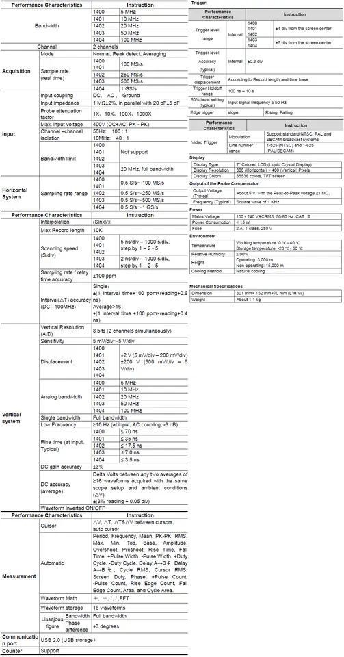 - Akcesoria: kabel USB, płyta CD z oprogramowaniem dla Windows, kabel zasilający, sondy i instrukcja obsługiSpecyfikacja: