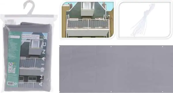 Osłona balkonowa Parawan balkonowy wodoodporna 76x 445cm Osłona balkonowa chroni przed wiatrem i innymi niekorzystnymi warunkami atmosferycznymi. Odporny na promieniowanie UV, wodoodporna. Osłona posiada otwory aluminiowe wzdłuż górnej i dolnej części, przez które przeciąga się 12 linek mocujących przesłonę do balustrady. Dane techniczne: Wymiary 76x445cm, Materiał:Poliestrowy, Aluminiowe otwory, Wodoodporny materiał, Poszycie odbijające promieniowania UV, Kolor:beż, 12 linek mocujących 70 cm.