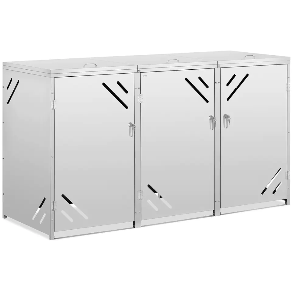 Osłona na kosz marki Ulsonix pozwala dyskretnie ukryć trzy kosze na śmieci o pojemności do 240 l. Zapewnia dobre wrażenie na posesji prywatnej czy w firmie. Obudowę wykonano z wytrzymałej stali nierdzewnej, dzięki czemu jest odporna na działanie warunków atmosferycznych i łatwa w pielęgnacji. Trzy przegrody pozwalają na segregację odpadów w elegancki sposób. Szczeliny w obudowie zapewniają wentylację wewnętrzną. Osłona na śmietnik ma drzwi zamykane na zamek, chroniący przed niepowołanymi osobami czy dzikimi zwierzętami. Pokrywa jest otwierana uchwytem i utrzymywana za pomocą sprężyny gazowej.