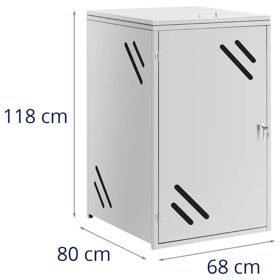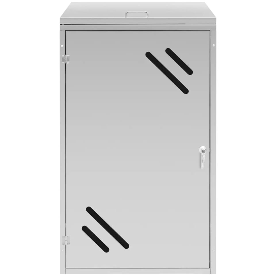 Kod produktu: 1031654Osłona na kosze na śmieci marki Uniprodo to nie tylko dyskretne miejsce na kubły, ale i konstrukcja o eleganckim designie. Praktyczna obudowa to idealne rozwiązanie zarówno pod względem funkcjonalnym, jak i wizualnym. Zmieści się w niej kubeł na kółkach o pojemności do 240 litrów, a jednocześnie łatwo się do niego dostać. Niezależnie od tego, czy to na skraju ogrodu, w garażu, czy na dziedzińcu kompleksu budynków, osłona śmietnikowa będzie idealnym miejscem do bezpiecznego i dyskretnego przechowywania pojemnika na odpadki. Obudowa wykonana ze stali nierdzewnej o grubości 0,7 mm zapewni bezpieczne i niezawodne przechowywanie kubła na zewnątrz. Odporny na warunki atmosferyczne materiał jest również wyjątkowo łatwy w utrzymaniu. Bez wysiłku można wyczyścić go z wszelkich zabrudzeń. Szczeliny wentylacyjne wpływają na higieniczność osłony. Zadbają bowiem o optymalny przepływ powietrza. Wewnątrz można umieścić dowolny kosz - na odpady organiczne, zmieszane czy papier. Drzwiczki obudowy zamykane są na bezpieczny, solidny zamek. Zapobiegnie to przedostawaniu się dzikich zwierząt lub wyrzuceniu resztek przez osoby nieupoważnione. Drzwi otwiera się i zamyka bez wysiłku. Komora ma pokrywę, która pozostanie otwarta za sprawą sprężyny gazowej. Dzięki temu dostęp do osłony jest znacznie łatwiejszy, ponieważ nie trzeba będzie za każdym razem wyciągać i wkładać śmietnik z powrotem.Cechy produktu: