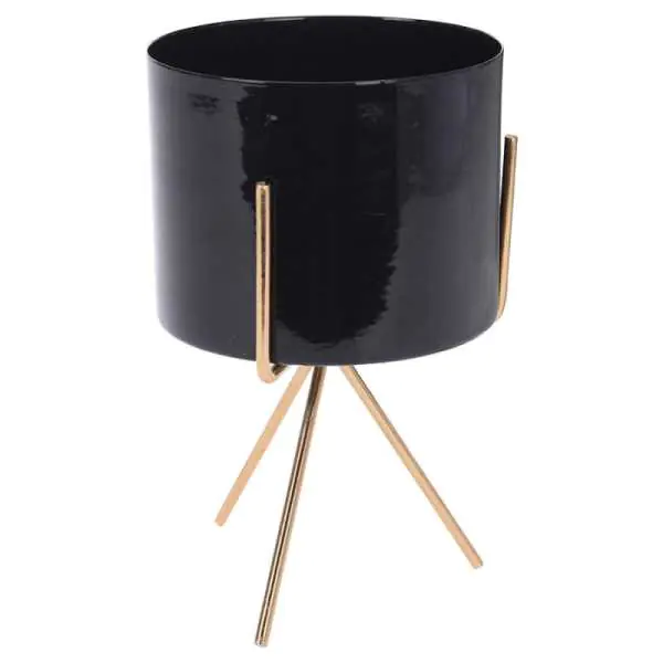 Osłonka na doniczkę metalowa czarna na nóżkach Chcesz odświeżyć wizerunek swojego wnętrza, zaopatrz się w przepiękne w swojej prostocie osłonki na doniczki. Wystarczy kilka i już Twoje pomieszczenie zyska zupełnie inny wygląd. Postaw je w różnych miejscach swojego biura, pokoju i ciesz się zupełnie nowym wystrojem swojego pomieszczenia. Specyfikacja: wymiary: 12x22cm, kolor osłonki: czarna, kolor nóg: złoty.