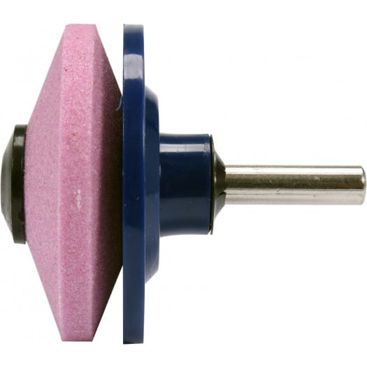 Wyprofilowana tarcza ścierna wykonana z korundu chromowego jest trwale osadzona na stalowym trzpieniu fi 6 mm . Konstrukcja ostrzarki umożliwia ostrzenie noży kosiarek bez pracochłonnego ich demontowania. Obroty maksymalne ok. 4500 /min