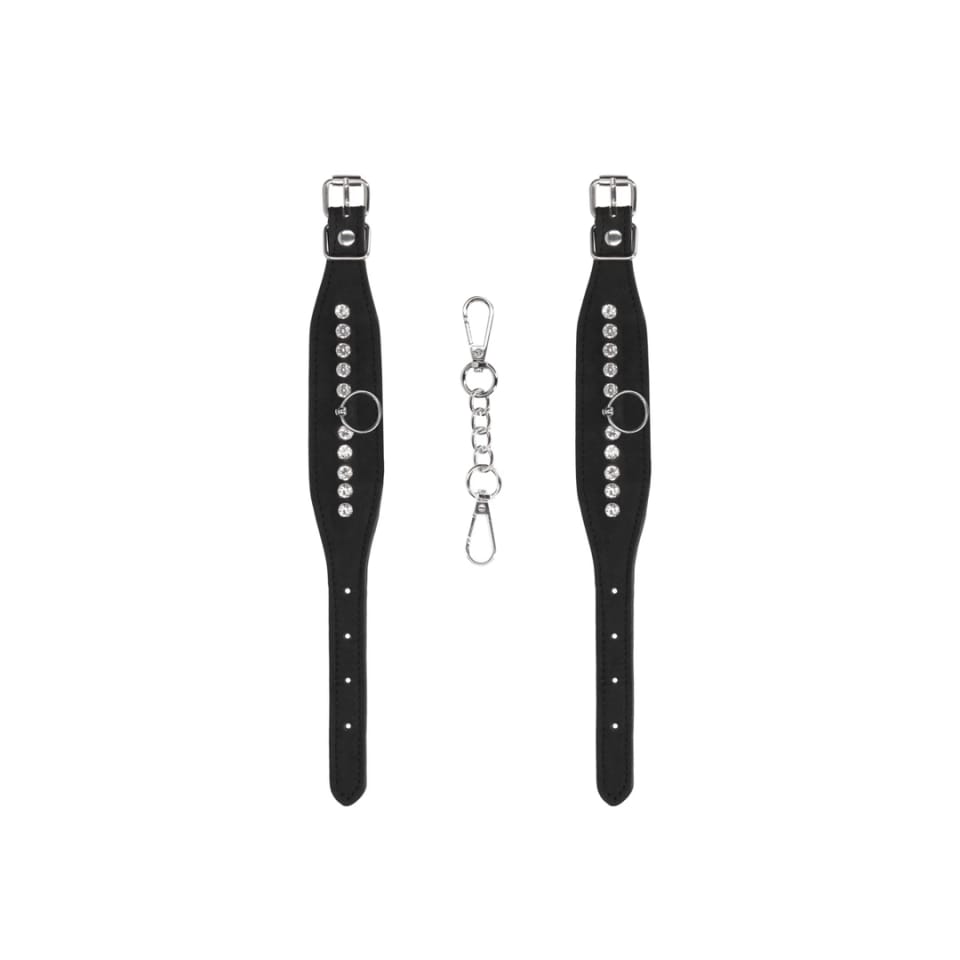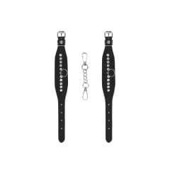Ouch! by Shots Diamentowe mankiety na nadgarstki, regulowane, czarne to stylowy i wytrzymały model przeznaczony dla osob poszukujących wysokiej jakości akcesoriow do kontrolowania ruchu dłoni. Wykonane z trwałej skory syntetycznej, mankiety te zostały ozdobione efektownymi, diamentowymi ćwiekami, co nadaje im nowoczesny i ekskluzywny wygląd.