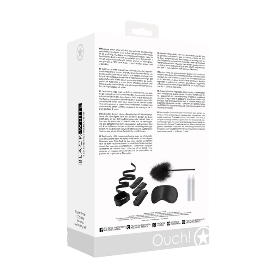 Ouch! by Shots Zestaw wiązań łożkowych 2 to kompletny zestaw przeznaczony do tworzenia nowych doświadczeń w domowym zaciszu. Model ten umożliwia wygodne przytrzymanie użytkownika za pomocą czterech aksamitnych, regulowanych opasek zakończonych wytrzymałymi wiązaniami. Elastyczna konstrukcja i uniwersalne zapięcia pozwalają na szybkie dopasowanie do większości łożek, zapewniając komfort użytkowania i bezpieczeństwo.