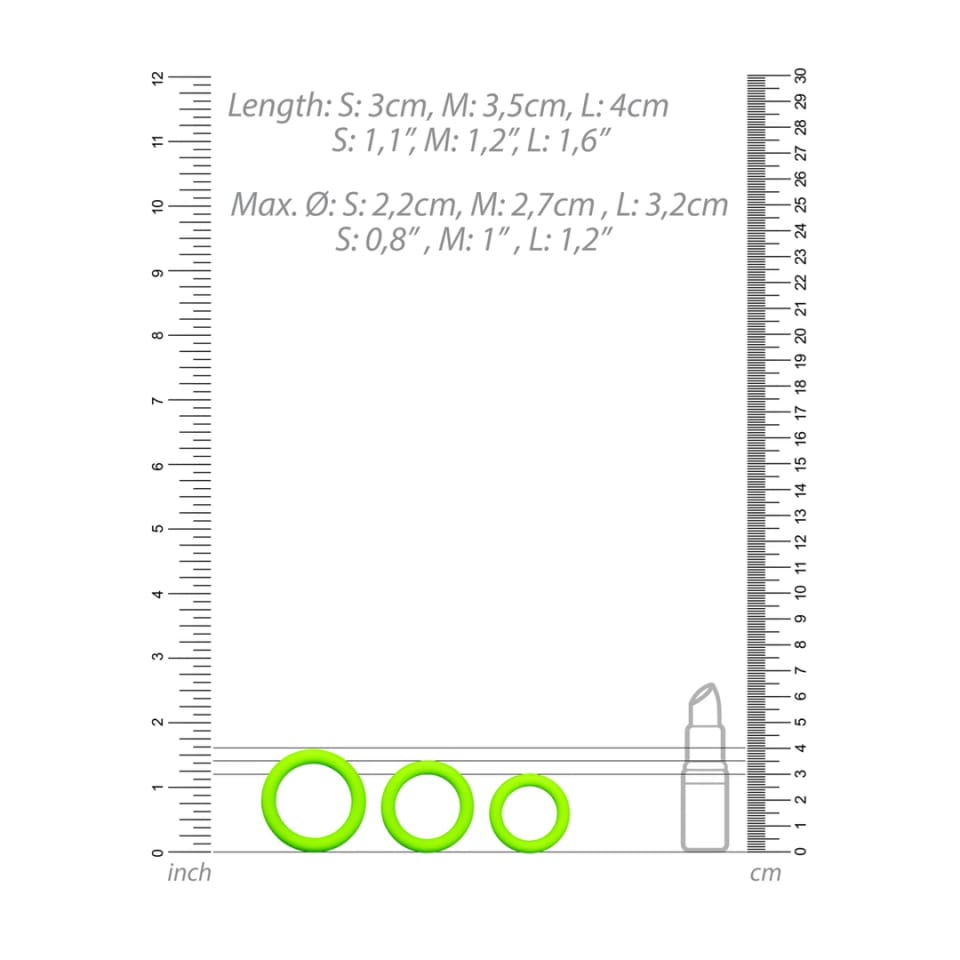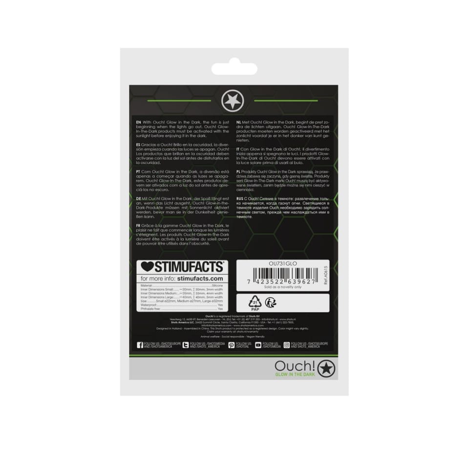 Zestaw pierścieni Ouch! Glow in the Dark to innowacyjna propozycja marki Ouch! dla osob poszukujących funkcjonalnych akcesoriow z nowoczesnym designem. Ten model to komplet trzech anatomicznych pierścieni wyrożniających się fluorescencyjną powierzchnią, ktora po wcześniejszym naświetleniu światłem dziennym lub sztucznym świeci w ciemności. Dzięki temu produkt zyskuje nie tylko praktyczne zastosowanie, ale także unikalny, efektowny wygląd podczas użytkowania w zaciemnionym otoczeniu.