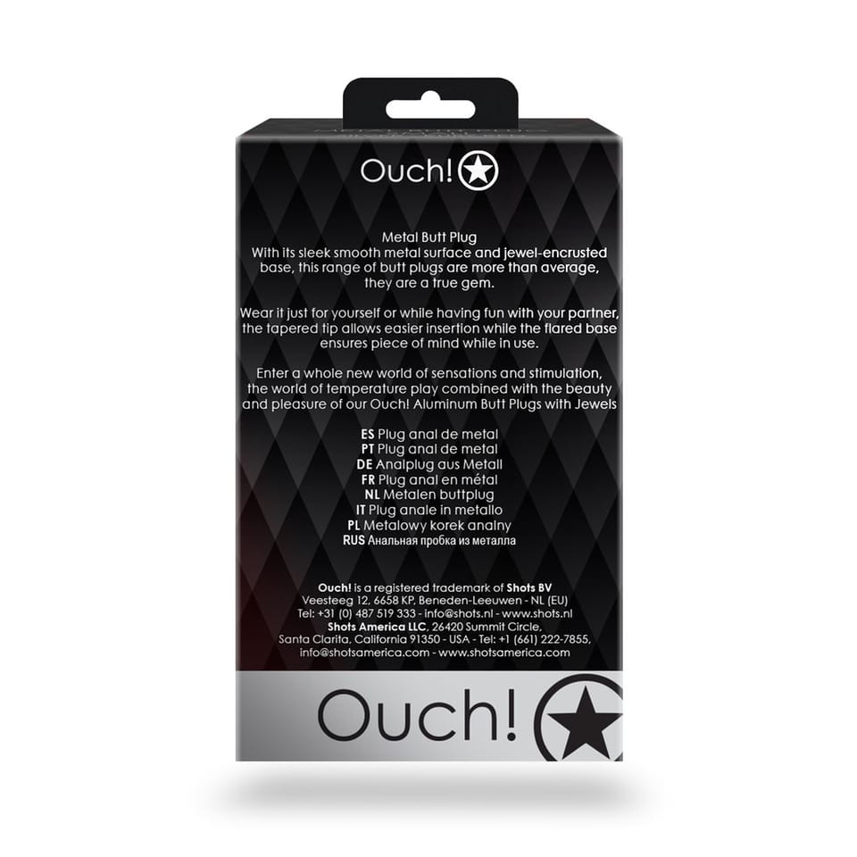 Model marki Ouch! to propozycja dla osob poszukujących wyjątkowo eleganckiego akcesorium o solidnym wykonaniu i nowoczesnym designie. Produkt został wykonany z wysokiej jakości, gładkiego metalu, co zapewnia komfort użytkowania oraz łatwość utrzymania czystości. Anatomiczny kształt z lekko zwężaną końcowką ułatwia aplikację, a szeroka, ozdobna podstawa z umieszczonym efektownym kryształkiem gwarantuje bezpieczeństwo oraz stabilność użytkowania.