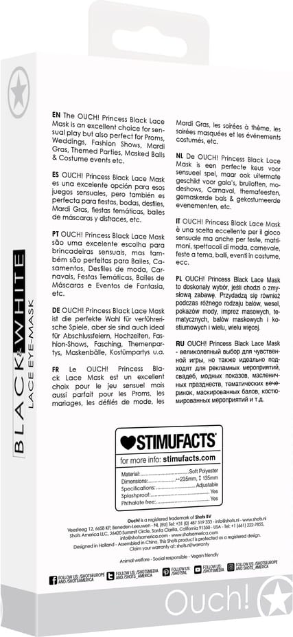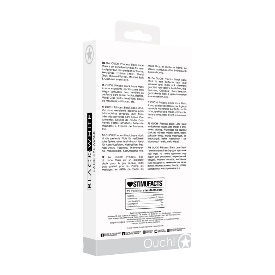 Wyjątkowa maska na oczy marki Ouch! z serii Princess została wykonana z najwyższej jakości materiałow, z dbałością o każdy detal. Nowoczesna technologia cięcia laserowego pozwoliła uzyskać skomplikowane, weneckie wzory, ktore wzbogacają całość niepowtarzalnym charakterem. Delikatna koronka otula twarz, zapewniając komfort nawet podczas wielogodzinnego użytkowania.