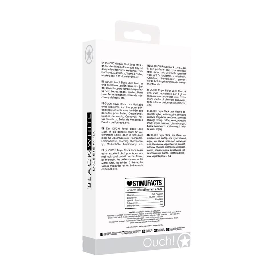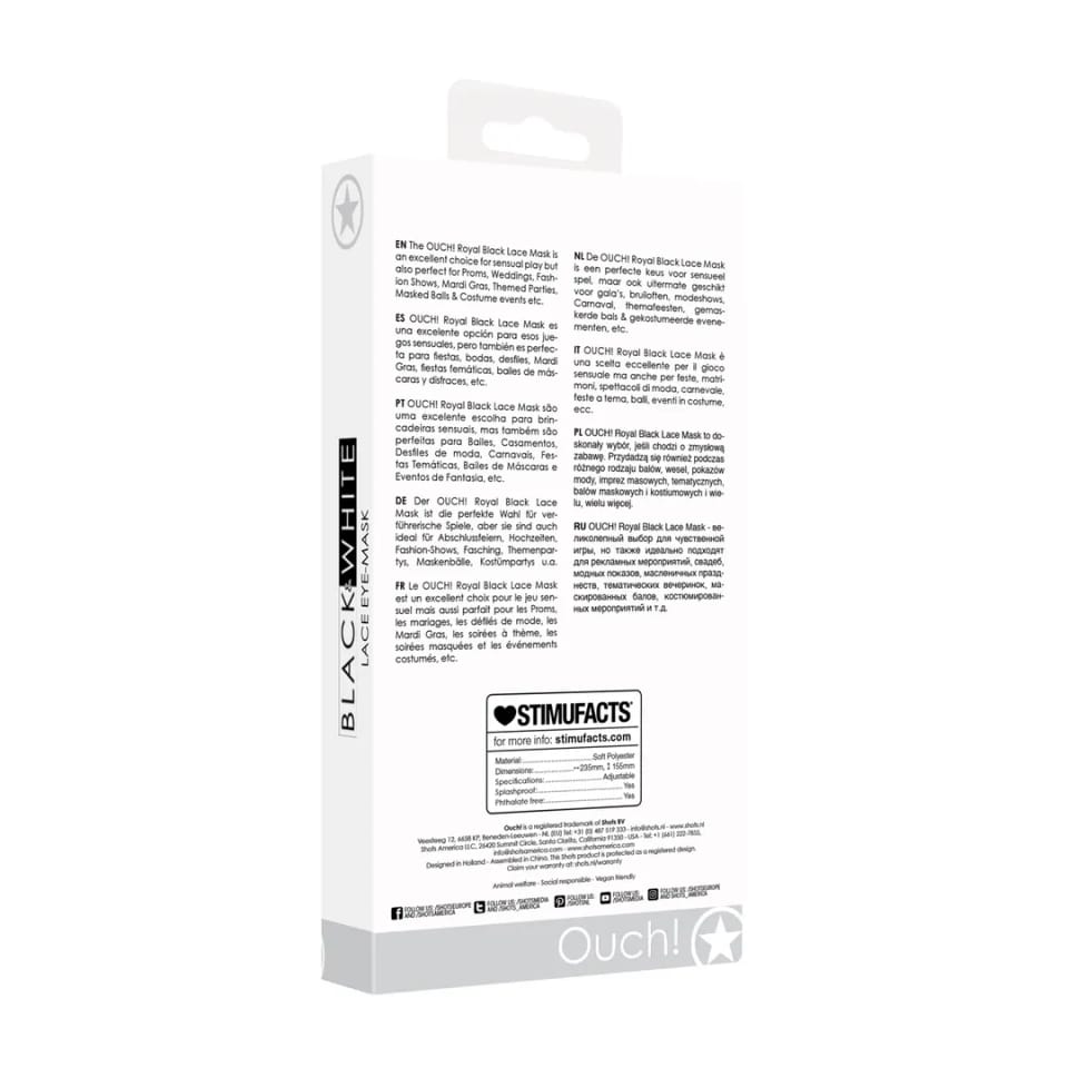 Maska OUCH! Royal Black Lace Mask to starannie wykonany, elegancki dodatek, ktory łączy nowoczesny design z precyzyjną technologią cięcia laserowego. Delikatne, ażurowe wzory inspirowane weneckimi motywami nadają masce unikalny i efektowny wygląd, sprawiając, że jest doskonałym wyborem na specjalne okazje.