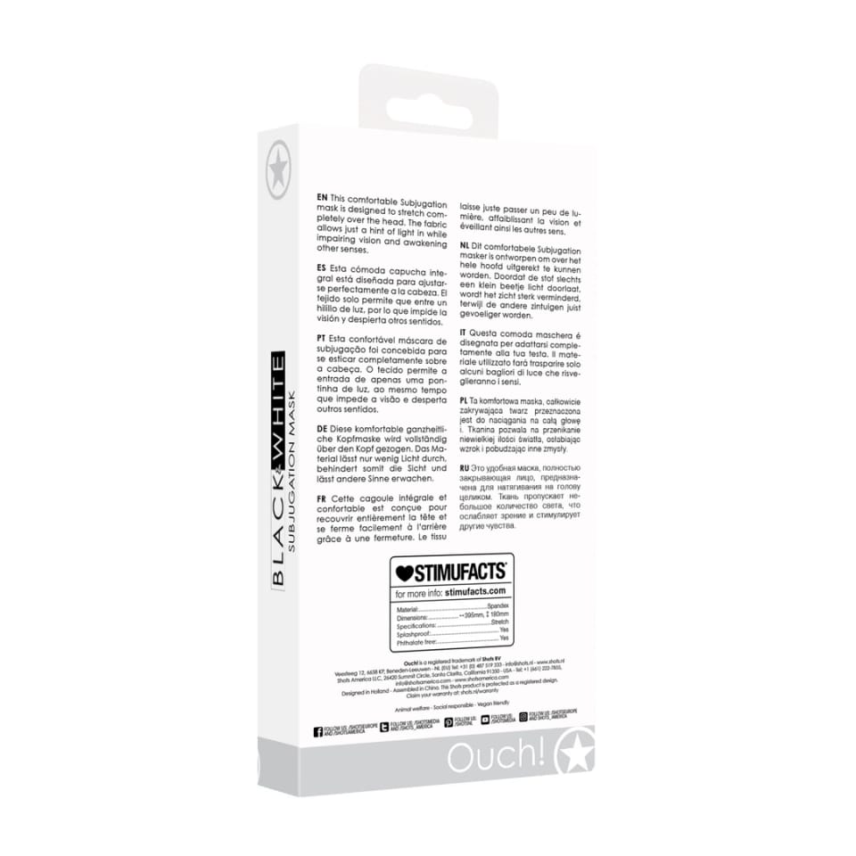 Ouch! Subjugation – anatomiczna maska z zamkiem błyskawicznym wykonana z oddychającej, elastycznej tkaniny. Model ten zaprojektowano z myślą o komforcie oraz dopasowaniu do rożnych kształtow głowy – zarowno dla niej, jak i dla niego.