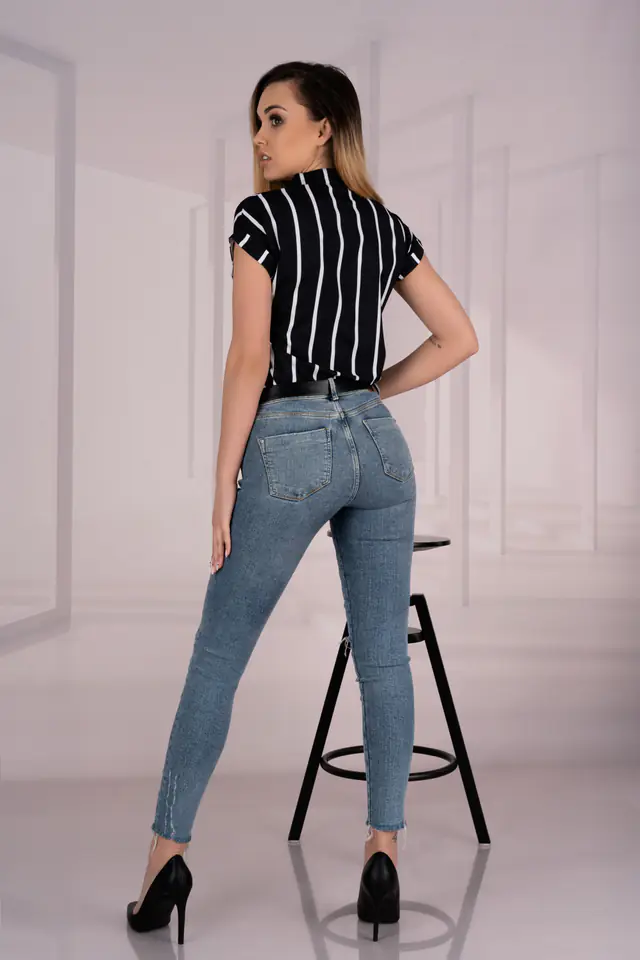 Elegancka, prosta bluzka o lekko dopasowanym kroju. Granatowa, w dekoracyjny print w pasy. Krótkie rękawy ozdobione zakładkami. Z przodu pliska z ozdobnymi guzikami i z szerszą stójką na guzik.