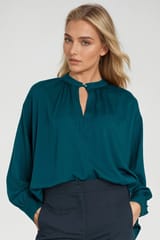 Krój oversize. Materiał wiskoza. Dekolt w kształcie łezki zapinany na guzik. Długi rękaw wykończony mankietem. Marszczenia przy dekolcie i mankietach. Skład: 100% wiskoza. Modelka na zdjęciu ma 176 cm wzrostu i ma sobie rozmiar 36.
