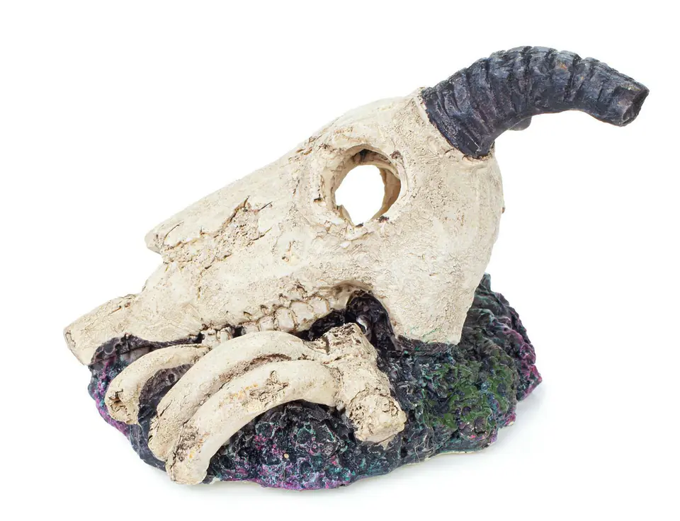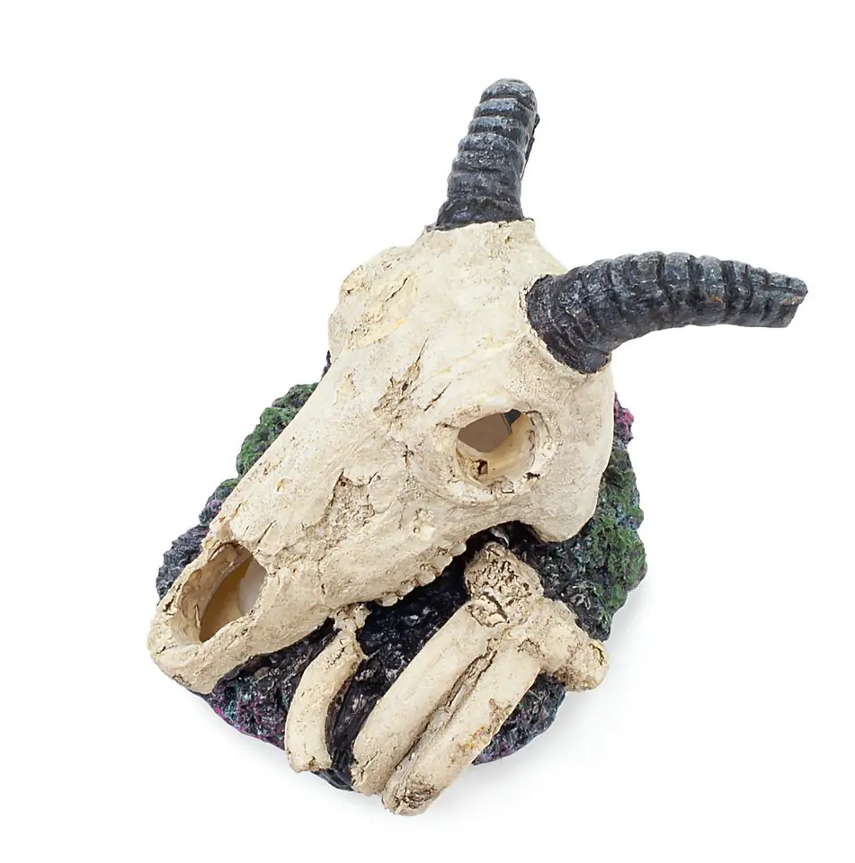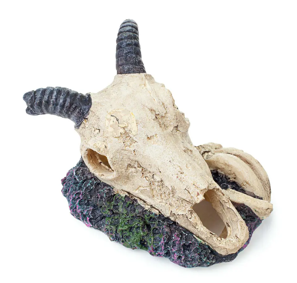 Ozdoba akwariowa - czaszka antylopy dla gadów, płazów i ryb Bardzo realistyczna ozdoba w kształcie czaszki, nadająca się zarówno do akwariów, jak i terrariów. Nada niepowtarzalnego klimatu zbiornikom hodowlanym. Dobrze prezentuje się wśród roślin, i innych elementów dekoracyjnych, a także może posłużyć jako fantastyczna kryjówka. Wykonana jest z całkowicie bezpiecznych materiałów. W kontakcie z wodą nie wydziela szkodliwych substancji. Jest w pełni zanurzalna. Wymiary: 9 x 7 x 6,5 cm Materiał: poliester Opakowanie: 6 szt.