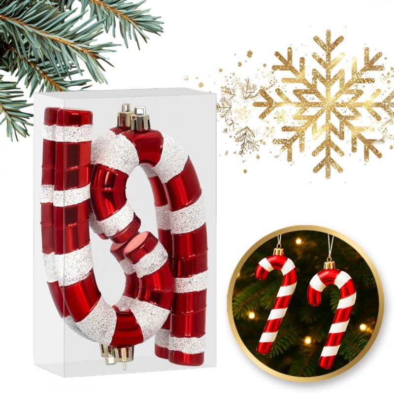 OZDOBA CHOINKOWA LIZAK 4 SZT. Dodaj swojemu wnętrzu odrobinę zimowej magii.Bombki nadają się jako ozdoba świąteczna do powieszenia na oknie, choince lub jako prezent, a nawet do dekoracji stroików! Specyfikacja: Materiał: Tworzywo sztuczneKolor: Czerwony i białyWymiary:7 cm x 14 cmWaga:g Poczuj świąteczny klimat!
