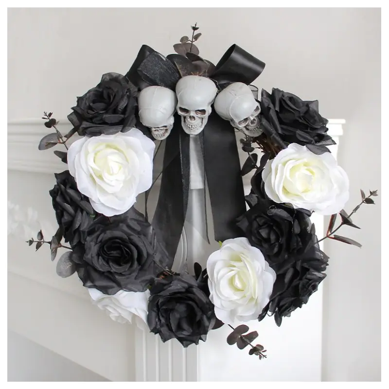Ozdobna wiązanka na drzwi/stół HALLOWEEN Świetnie wykonana i bardzo przerażająca, Halloweenowa wiązanka.Idealna na stół lub drzwi, doda charakteru, dzięki ozdobnym czaszkom,oraz mrocznej kolorystyce. Wysokość: 35 cmSzerokość: 35 cmGłębokość: 10 cm