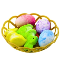 Ozdoby wykonane są z lekkiego i trwałego styropianu. Koszyczek, w którym znajdują się dekoracje, jest wykonany z plastiku, który nadaje całości stabilność i ułatwia eksponowanie zestawu. Możesz umieścić go na wielkanocnym stole, komodzie, półce lub w stroiku ? jego uniwersalny wygląd pasuje do każdej dekoracji świątecznej.