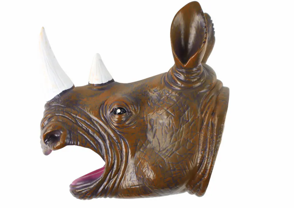 Nosorożec ma charakterystyczne, czarne oczy, które nadają mu autentycznego wyrazu i sprawiają, że wydaje się być żywym stworzeniem. Jednym z jego najbardziej charakterystycznych elementów są jego rogi, które zostały starannie odwzorowane, nadając pacynce autentycznego wyglądu.