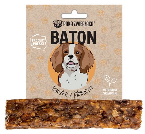 PAKA ZWIERZAKA Baton Kaczka z jabłkiem 12 cmBaton wykonany ręcznie, pozbawiony klejów i barwników. Stworzony tylko z naturalnych składników najwyższej jakości. Bezpieczny dla dziąseł psa, nie zawiera ostrych elementów.Przysmak wyprodukowany w Polsce pod nadzorem Powiatowego Lekarza Weterynarii.Gryzak wspomaga prawidłowe utrzymanie higieny jamy ustnej i zaspokaja naturalną potrzebę gryzienia i żucia.
