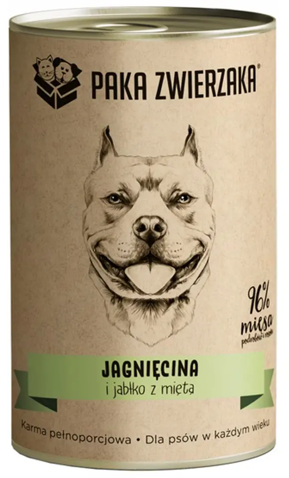 PAKA ZWIERZAKA Jagnięcina i jabłko z miętąNaturalna karma mokra jest kompletnym i zbilansowanym posiłkiem dla psiaków w każdym wieku. Zawiera aż 96% jagnięciny z rosołem! Przygotowana z najwyższej jakości świeżego i soczystego mięsa i podrobów. Bogata w składniki odżywcze i wysoko przyswajalne źródła białka zwierzęcego. Dzięki zastosowaniu jednego rodzaju białka jest to odpowiednia karma do zmniejszenia ryzyka alergii i nietolerancji pokarmowej.