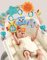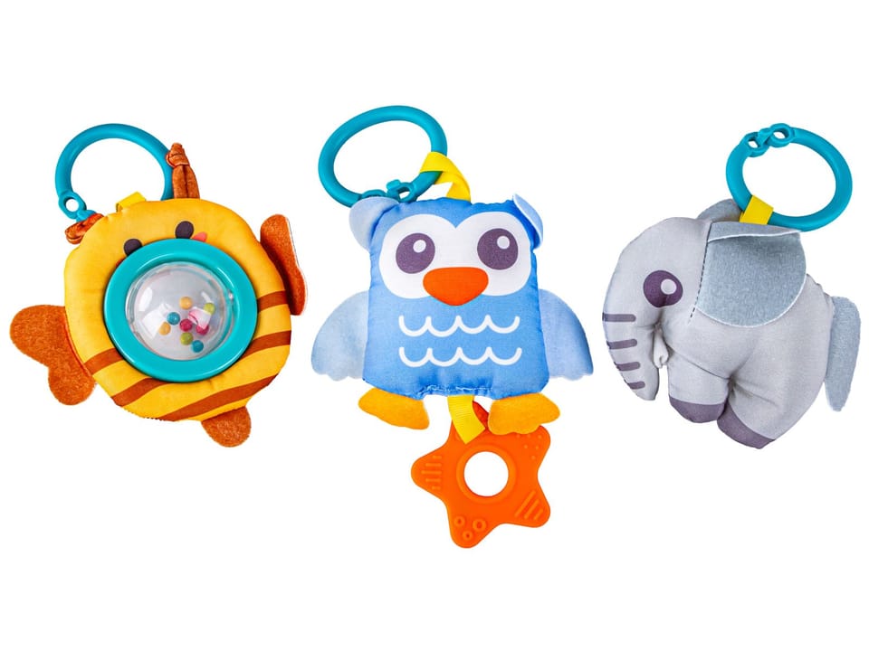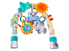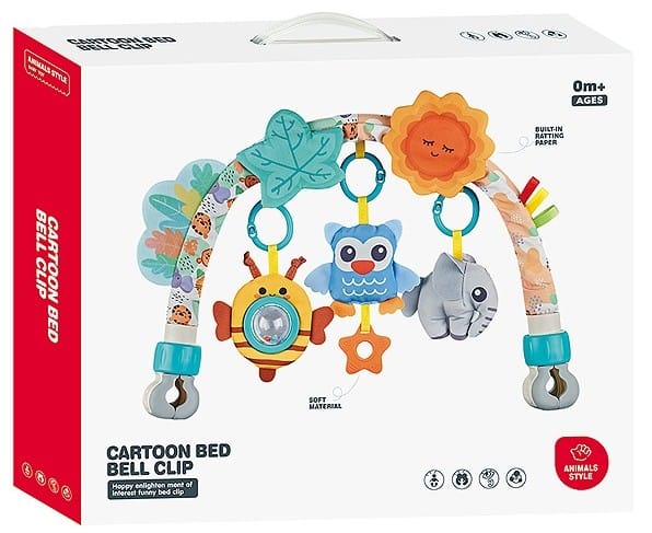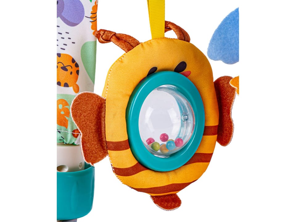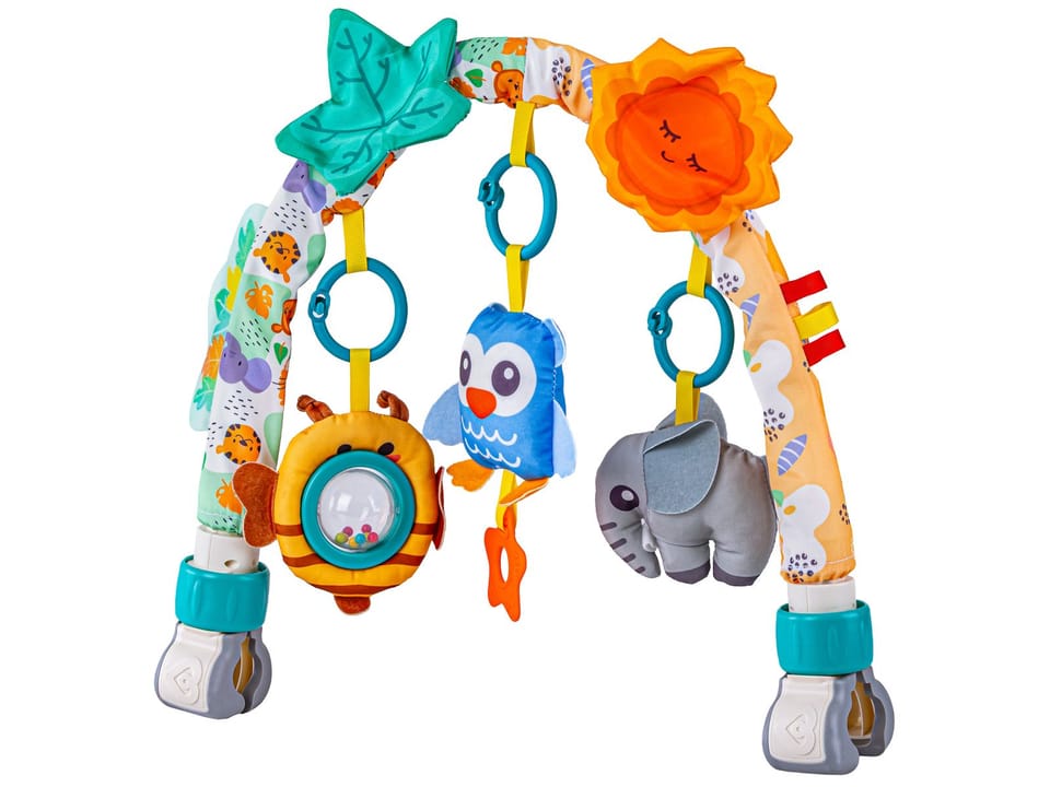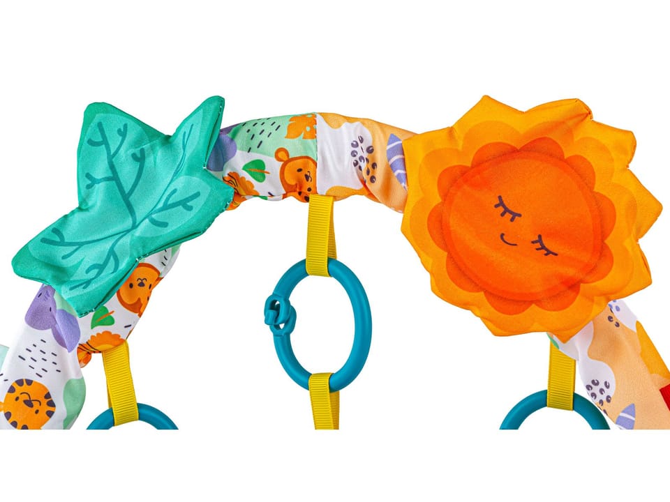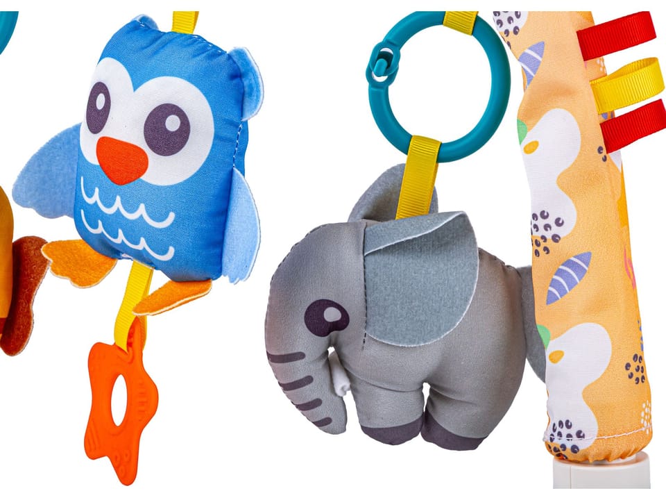 Wiszące na łuku zawieszki w kształcie pszczółki, sówki i słonika przyciągają wzrok intensywnymi kolorami oraz zachęcają maluszka do wyciągania rączek, chwytania i ćwiczenia koordynacji wzrokowo-ruchowej. Każdy element został zaprojektowany w taki sposób aby był jednocześnie bezpieczny i stymulujący rozwój dziecka.