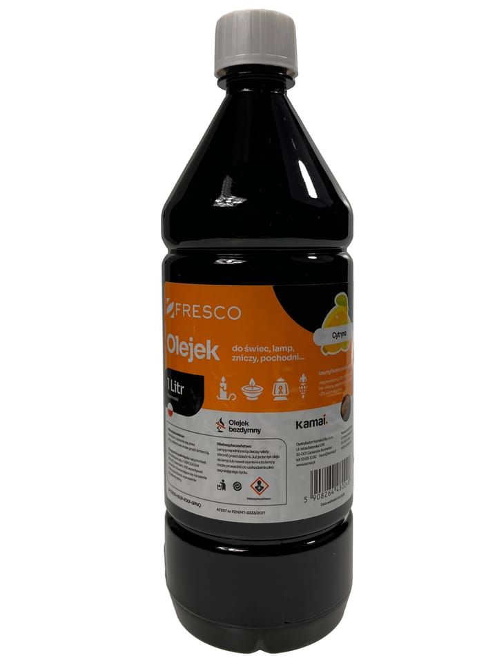 Olej do lamp, pochodni i świec polskiej produkcji o zapachu cytryny.