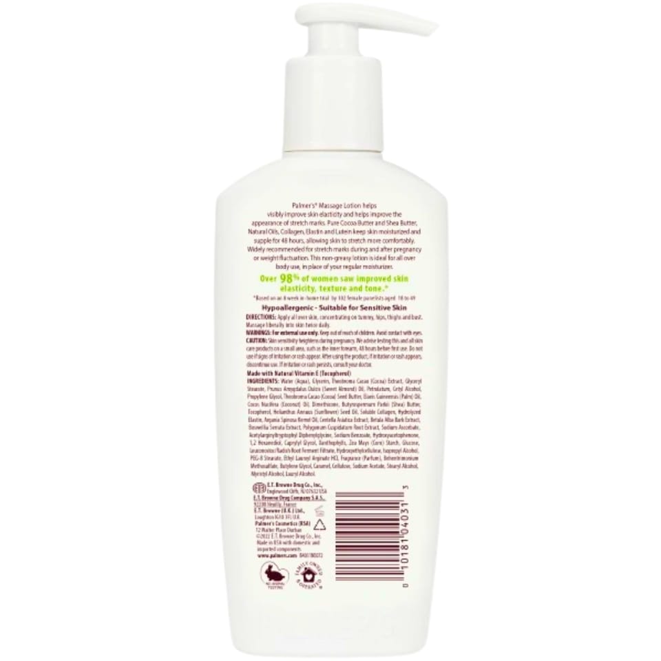 PALMER'S Cocoa Butter Formula Massage Lotion for Stretch Marks pielęgnacyjny balsam przeciw rozstępom 250ml (P1)010181040313Pielęgnacyjny balsam przeciw rozstępom to unikalna formuła balsamu na bazie masła kakaowego wzbogacona witaminą E, masłem shea oraz Bio C - ElasteTM. Bio C - ElasteTM to wyjątkowo silna kombinacja aktywnych składników: kolagenu, elastyny, wąkrotki azjatyckiej, wyciągu ze słodkich migdałów oraz olejku arganowego. Balsam pomaga w zapobieganiu i eliminowaniu powstawania rozstępów skóry w okresie ciąży. Stosowanie go w formie masażu przywraca naturalne nawilżenie i elastyczność skóry. Eliminuje efekt suchości, aktywnie wygładza wcześniej powstałe rozstępy. Głównie zalecamy stosowanie preparatu w czasie ciąży. Należy go stosować zamiast zwykłego balsamu nawilżającego nawet 3 razy dziennie. Balsam przeznaczony jest również dla osób z tendencją do powstawania rozstępów, np. przy szybkiej utracie wagi ciała, u nastolatków w okresie wzrostu. Może być stosowany na całe ciało. Hypoalergiczny. Bez parabenów. Bez ftalanów. Bez oleju mineralnego. Testowany dermatologicznie. Udowodnione uelastycznienie skóry podczas testu w 98% przypadków.