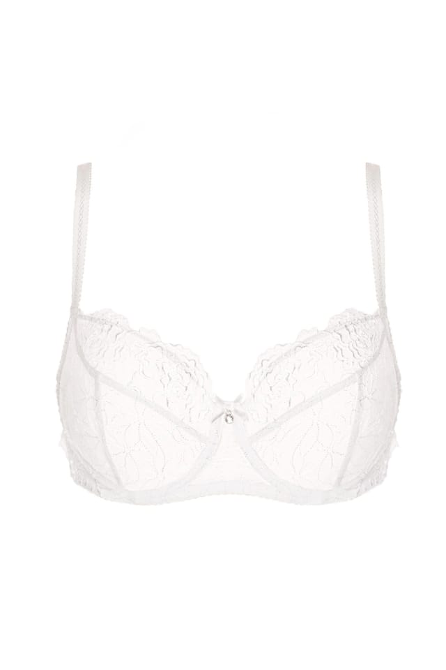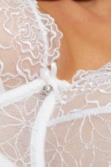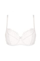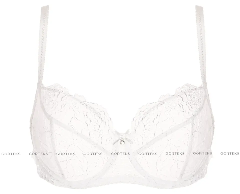 Biustonosz miękki wykonany z półprzeźroczystego haftu o subtelnym kwiatowym wzorze. Po bokach miseczki dodatkowo wzmocnione tiulem, który zapewnia lepsze zebranie biustu. Tył w całości wykonany z lekko połyskującej dzianiny gładkiej. Miseczki trzyczęściowe, o kroju balkonetki, delikatnie unoszą piersi nadając im piękny, naturalny kształt. Pionowe fiszbiny boczne zapobiegają marszczeniu się boczków. Wyjątkowego uroku bieliźnie dodaje szykowna kokardka z cyrkonią umieszczona między miseczkami.