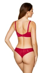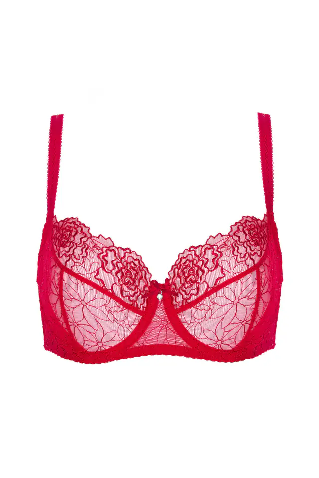 Biustonosz miękki wykonany z półprzeźroczystego haftu o subtelnym kwiatowym wzorze. Po bokach miseczki dodatkowo wzmocnione tiulem, który zapewnia lepsze zebranie biustu. Tył w całości wykonany z lekko połyskującej dzianiny gładkiej. Miseczki trzyczęściowe, o kroju balkonetki, delikatnie unoszą piersi nadając im piękny, naturalny kształt. Pionowe fiszbiny boczne zapobiegają marszczeniu się boczków. Wyjątkowego uroku bieliźnie dodaje szykowna kokardka z cyrkonią umieszczona między miseczkami.