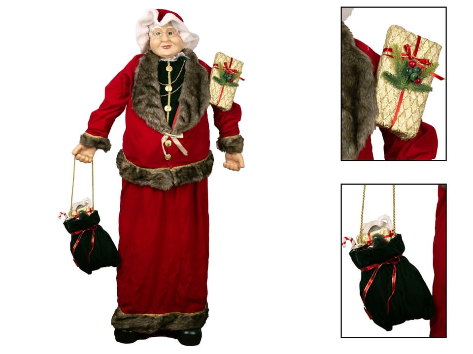 Duża figurka pani Mikołajowej wprowadza ciepły, radosny klimat świąt. Jej postawa emanuje dobrocią i radością, a szczegóły takie jak złote akcenty czy świąteczne dekoracje podkreślają magię Bożego Narodzenia.