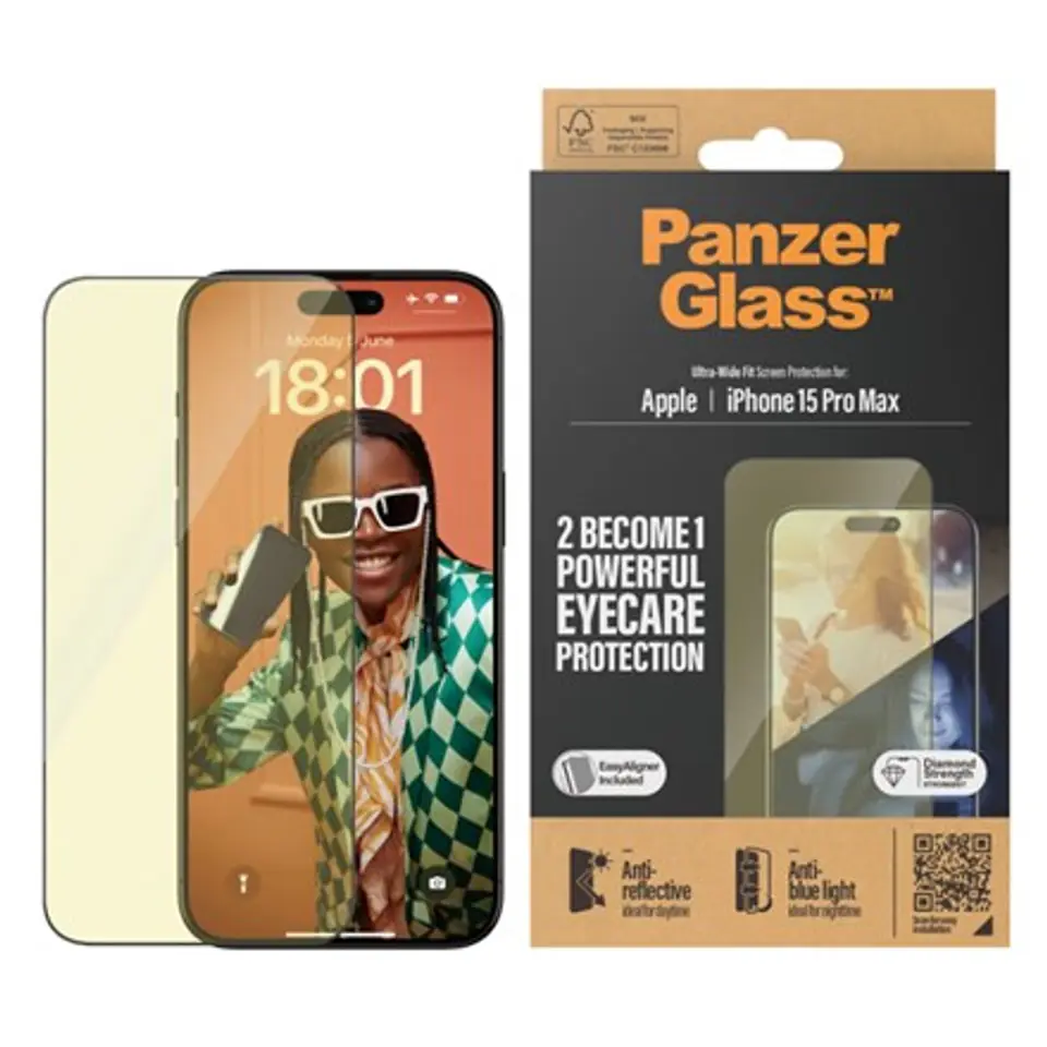 PanzerGlass | Screen protector | Apple | iPhone 15 Pro Max | Glass | Clear | Ultra-Wide Fit; Easy installation; Fingerprint resistant; Anti-blue light; Anti-reflective; Anti-yellowing | Eyecare