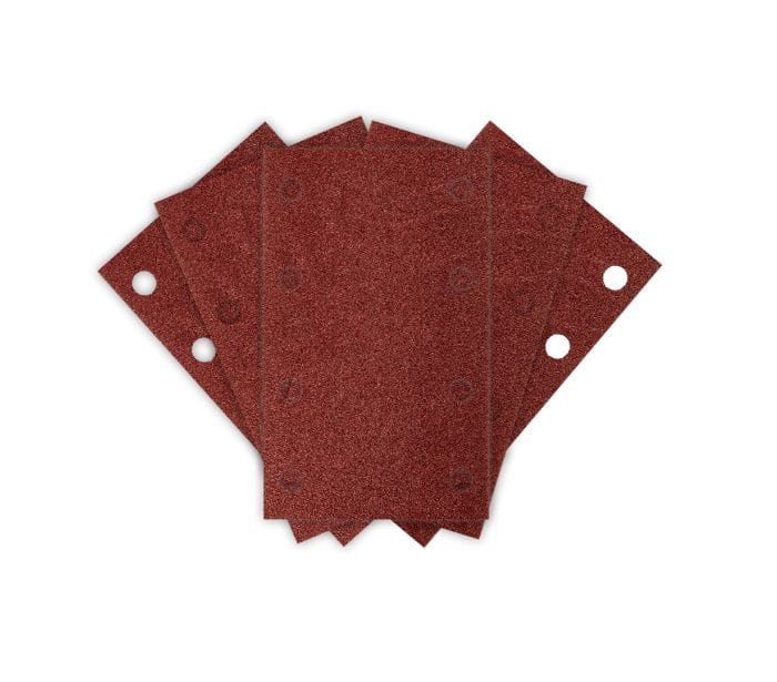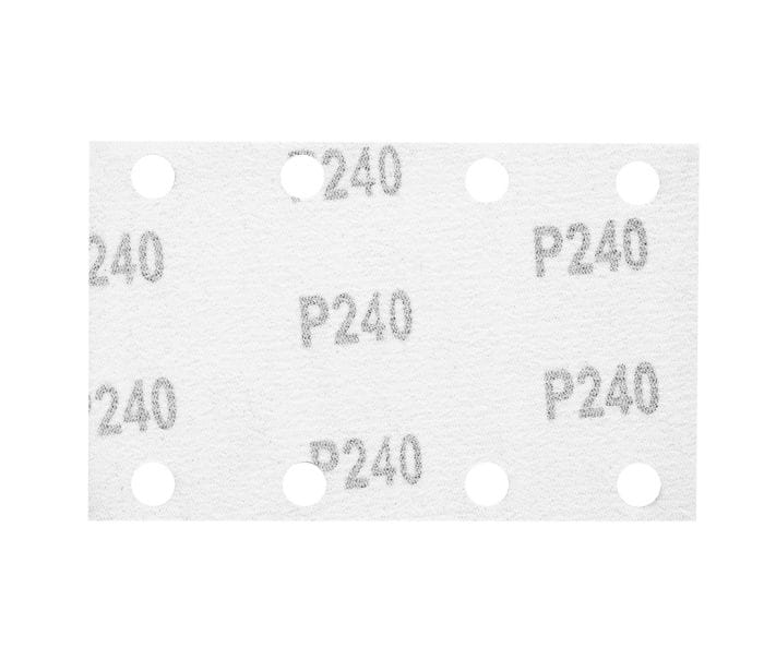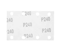 Papiery ścierne na rzep, prostokąt 80 x 130 mm, P240, 5 sztuk, z 8 otworami do 04-623, 54-052 NEO TOOLS to akcesorium przeznaczone do precyzyjnego szlifowania drewna, metalu, tworzywa sztucznego i płyt kartonowo-gipsowych. Dzięki wymiarom 130 x 80 mm oraz 8 otworom zapewnia efektywne odprowadzanie pyłu, co poprawia komfort pracy i wydłuża żywotność papieru. System mocowania na rzep umożliwia szybkie oraz wygodne zamocowanie na dedykowanej szlifierce oscylacyjnej 04-623 NEO TOOLS.