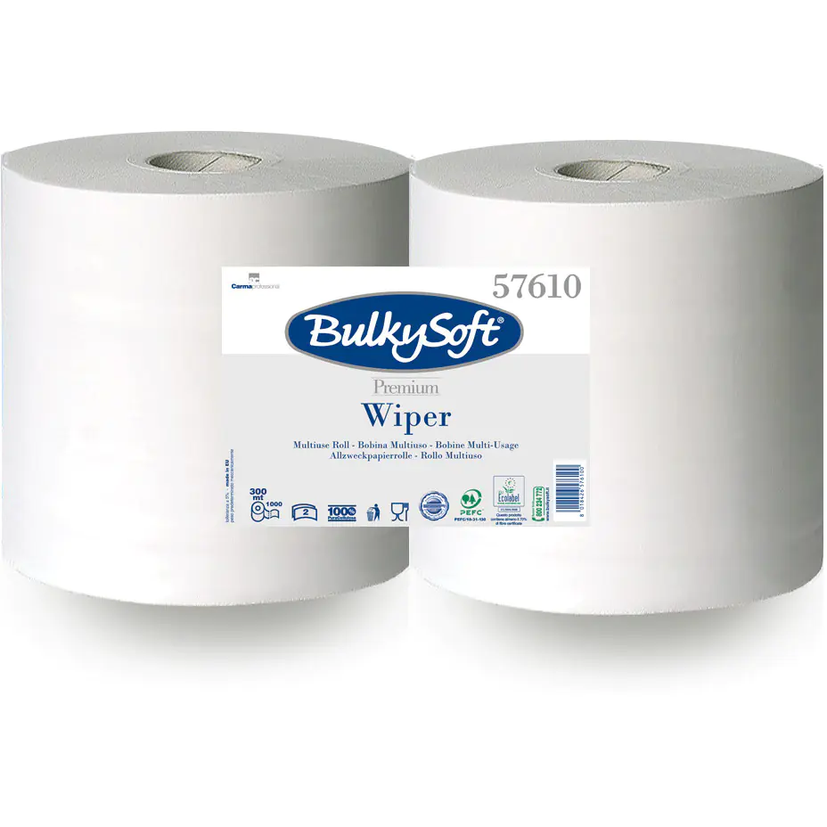 Bulkysoft - czyściwo papierowe, białe, dwuwarstwowe. Jedna rolka ma długość 300 metrów i podzielona jest na 1000 odcinków. Wykonano je z czystej, selekcjonowanej celulozy. Ma gładką strukturę i cechuje się ekonomicznością i wydajności. Ponadto czyściwo to jest uniwersalne, możliwe do zastosowania w różnych sytuacjach i miejscach. Przyda się zarówno do kontaktu z żywnością (posiada certyfikat ISEGA), do oczyszczania rąk, jak i czyszczenia przedmiotów i powierzchni - zarówno wodą, jaki detergentami czy rozpuszczalnikiem. To wyjątkowo chłonny produkt, dzięki czemu już jeden listek z powodzeniem spełnia swoje zadanie. Całość dopełnia estetyczny wygląd, elastyczność i miękkość w dotyku.