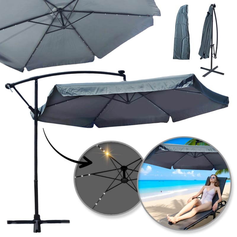 Parasol ogrodowy z wysięgnikiem + lampki SOLAR LEDParasol ogrodowy to idealny wybór dla osób poszukujących niezawodnej ochrony przed słońcem!Zaprojektowany z myślą o maksymalnej funkcjonalności i wygodzie. Zapewnia nie tylko cień, ale i ochronę przed szkodliwym promieniowaniem UV. Specyfikacja:- Poszycie parasola zapewnia odporność na m.in. przed wiatrem, deszczem i słońcem (filtr UV50+). Materiał jest wodoodporny.- Parasol posiada bardzo nowoczesny system regulacji wysokości i kąta nachylenia czaszy. - Solidny stelaż oraz 8 mocnych żeberek. Jakościowe wykonanie sprawia, że parasol znakomicie sprawdza się nawet przy niekorzystnych warunkach pogodowych.- Produkt jest składany, sposób rozkładania: korba.- Wbudowane lampki SOLAR LEDOświetlenie parasola zasilane jest energią słoneczną dzięki dołączonemu zasilaczowi solarnemu.Dzięki temu parasol nie wymaga podłączenia do sieci elektrycznej. Materiał:- Materiał poszycia: 100% poliester, gramatura 180 gr/m2- Materiał stelaża: stal Budowa:- 6 stalowych żeberek 12 x 18mm- Stalowa kolumna 48 mm- Podstawa: krzyżowa Wymiary i waga:- Średnica czaszy: 300 cm- Wysokość: 262 cm- Szkielet: żeberka: 12x18 mm, kolumna o średnicy 48 mm Waga: 15 kg Wymiary opakowania:198cm x 32cm x 15cm